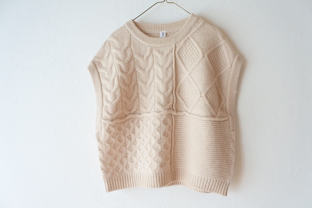 SO アラン柄パネルベスト size Free 着丈56cm 身幅56cm ウール100%ニット いろいろなアラン柄をパネルのように接ぎ合わせたベストです。つい手に取ってしまう、ワクワクしてしまう1枚に仕上がりました。 ※照明等の関係により、実物と多少色合いが異なりますので、ご了承下さい。