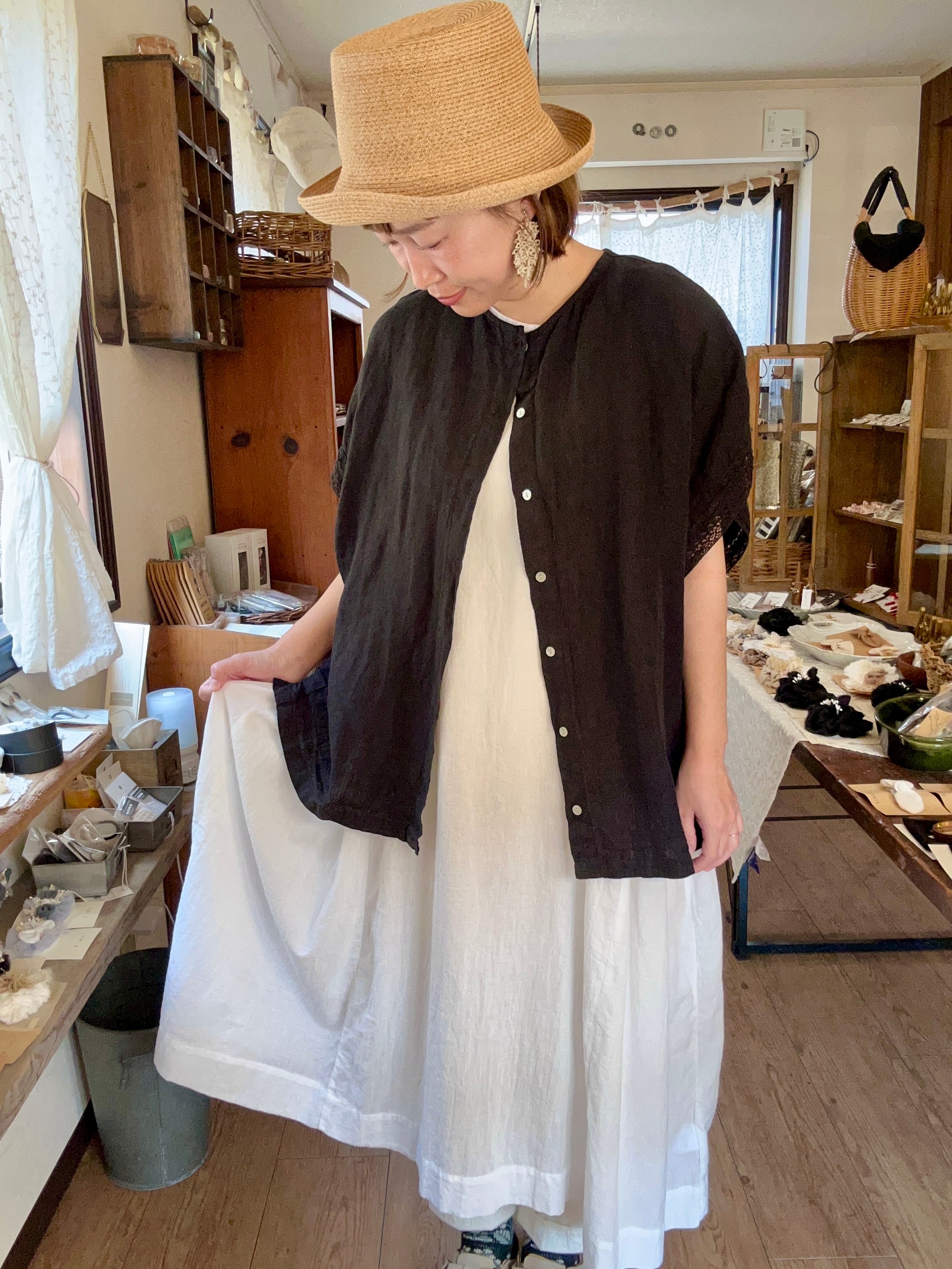 袖に幅太めのレースを使用しています。脇にマチとスリットを入れ、デザインのポイントにしています。前開きなので1枚でも、羽織としても着られるブラウスです。