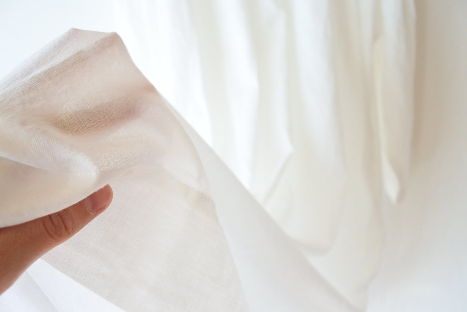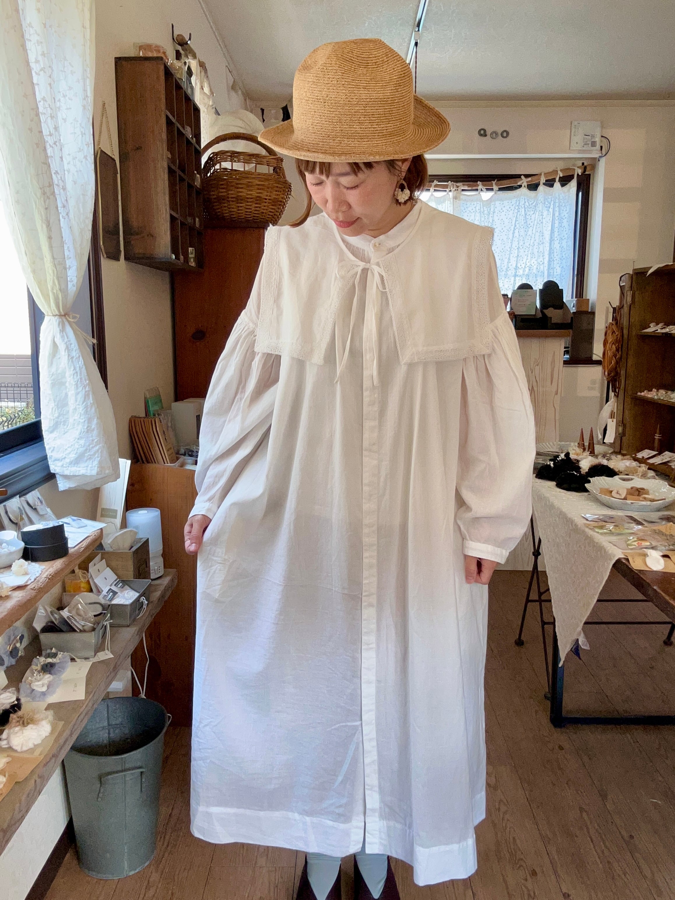 衿ぐりと、肩に大きくギャザーを入れたワンピースです。前は比翼開き仕様になっていますので、1枚着としても着用可能です。コーディネートのアクセントになるレーストリミングのつけ襟が付属します。