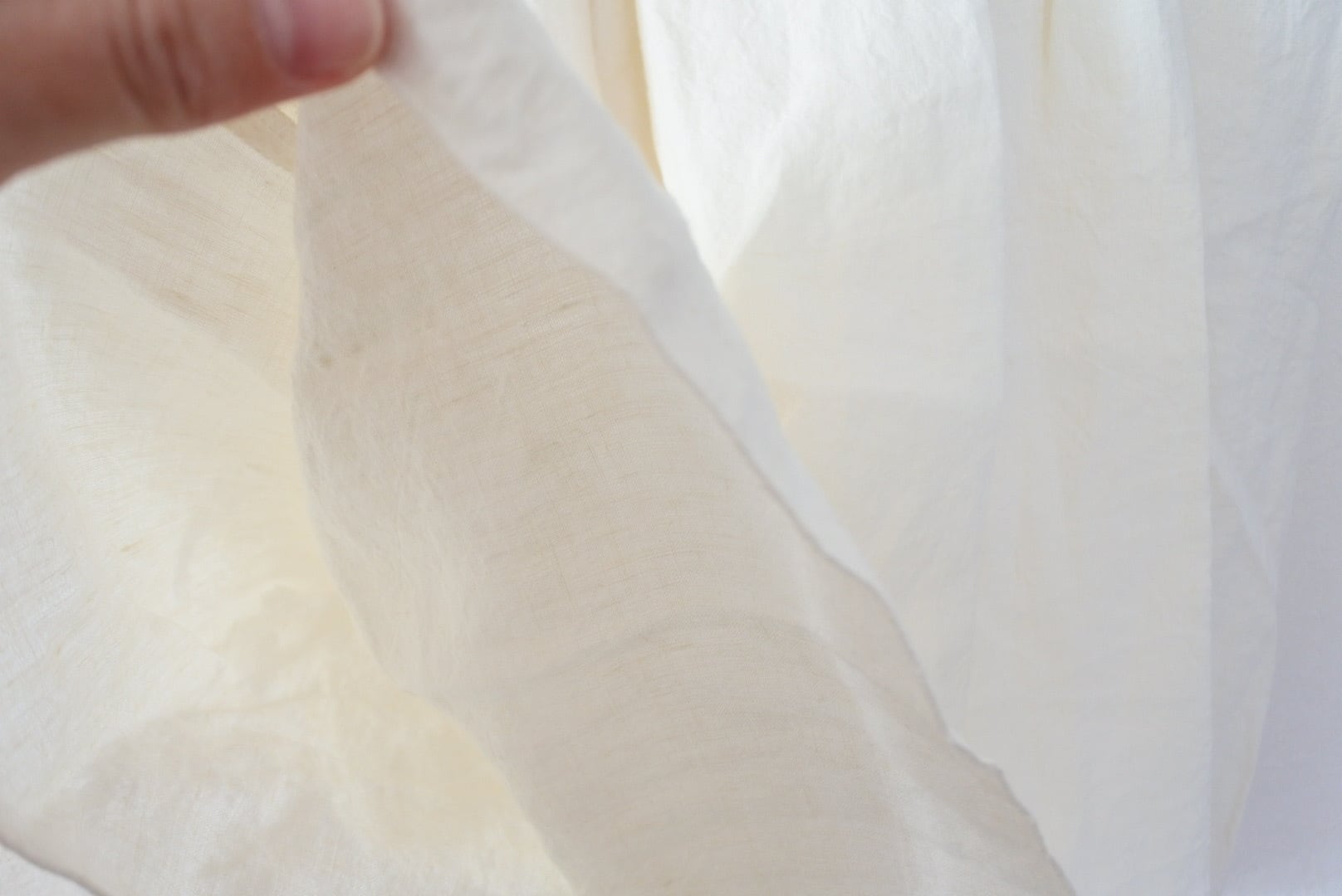 リネン素材の特徴として、植物の茎部分などの原料が入ってしまう場合があります。無理に取ろうとすると、糸切れを起こす恐れがございますので、リネン素材の特有として、ご理解下さい。
