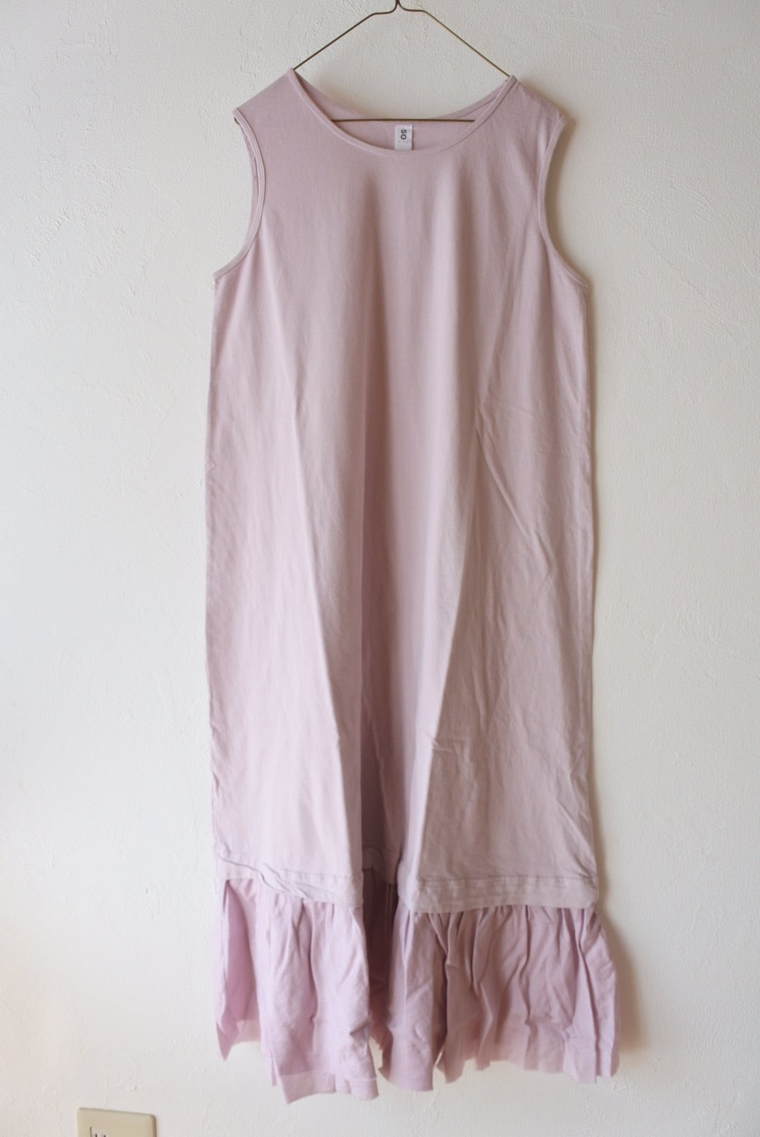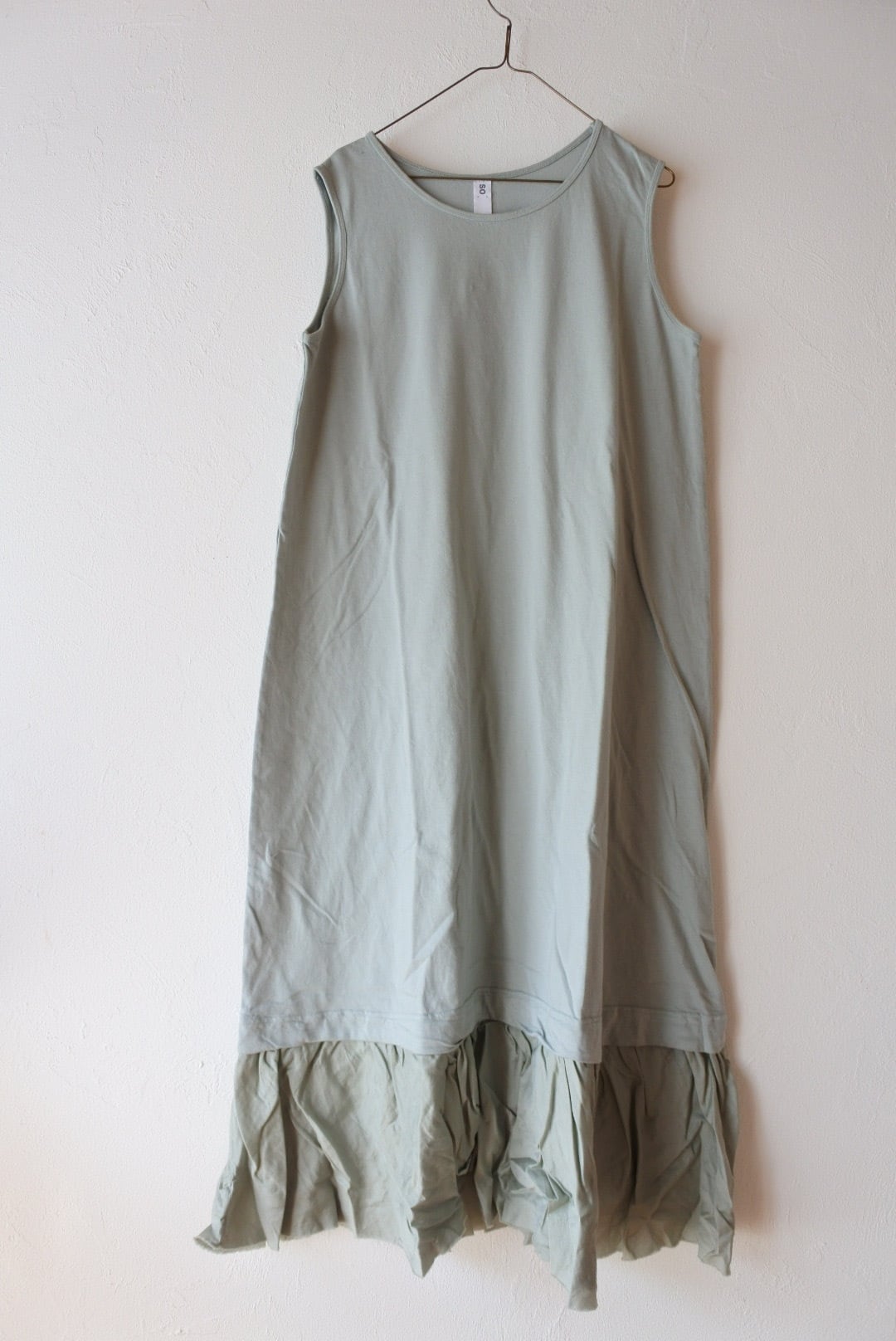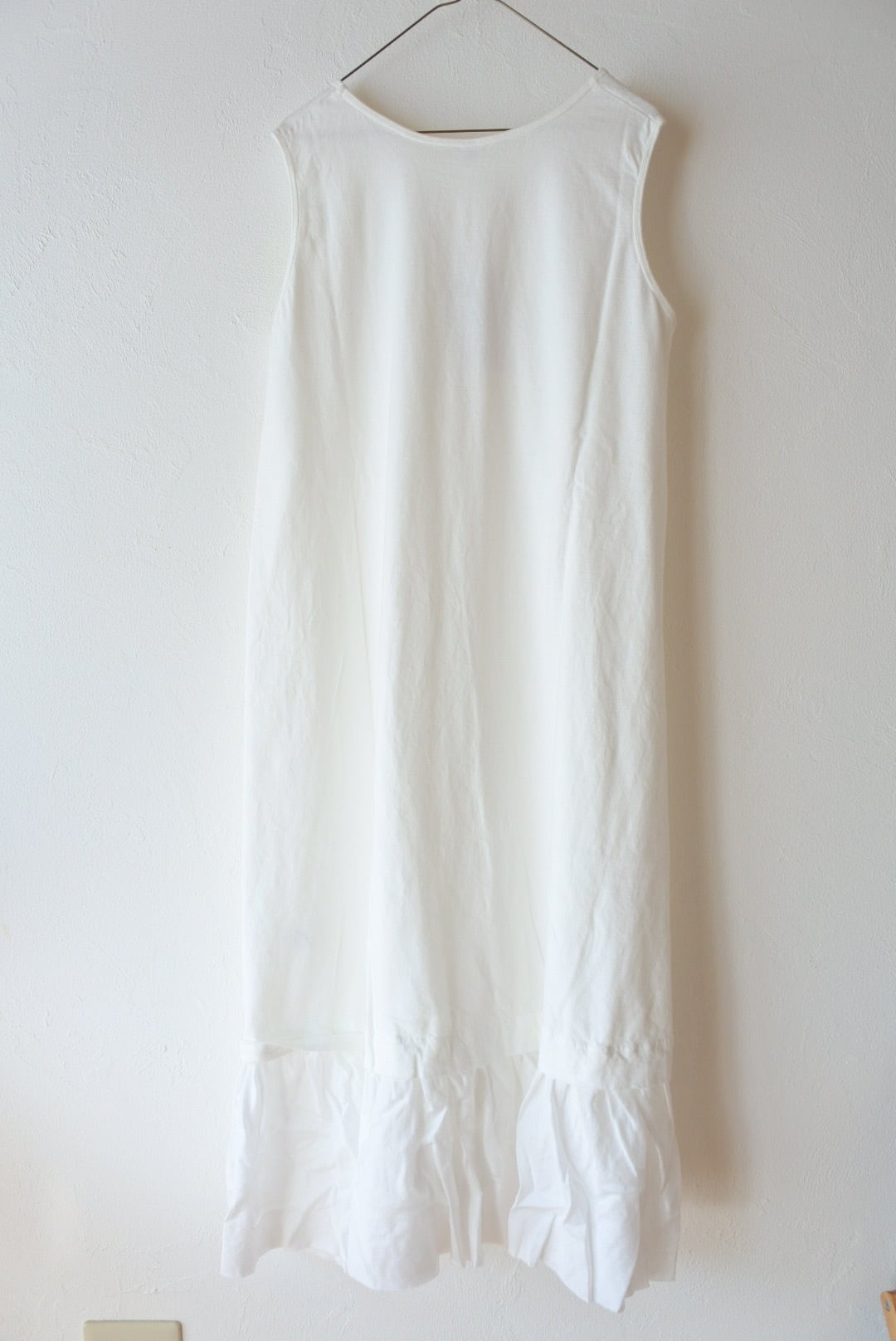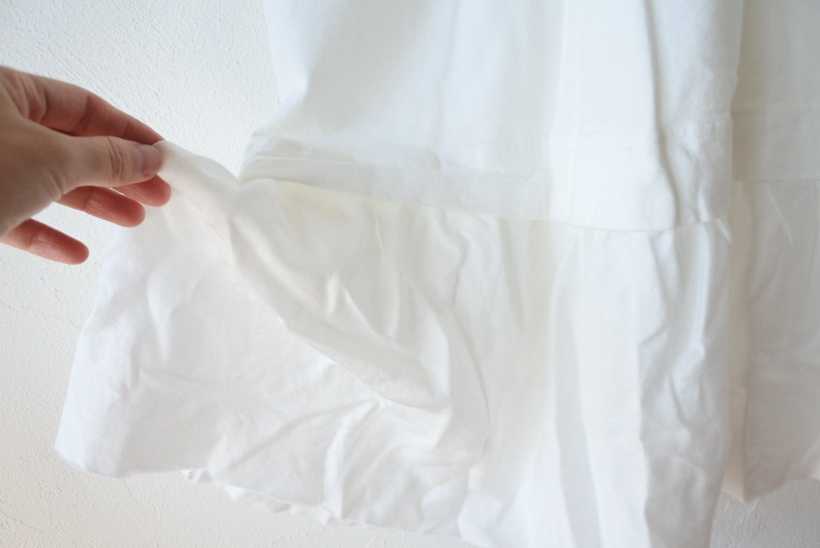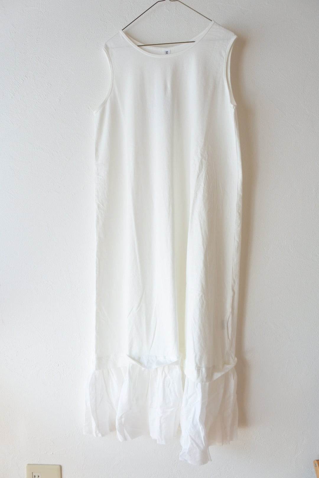製品染めの風合いや素材ごとの色差が生きるよう、シンプルな形のワンピースに大ぶりなフリルをあしらいました。Tシャツや羽織とのコーディネートはもちろん、インナーワンピースとしても優秀なアイテムです。