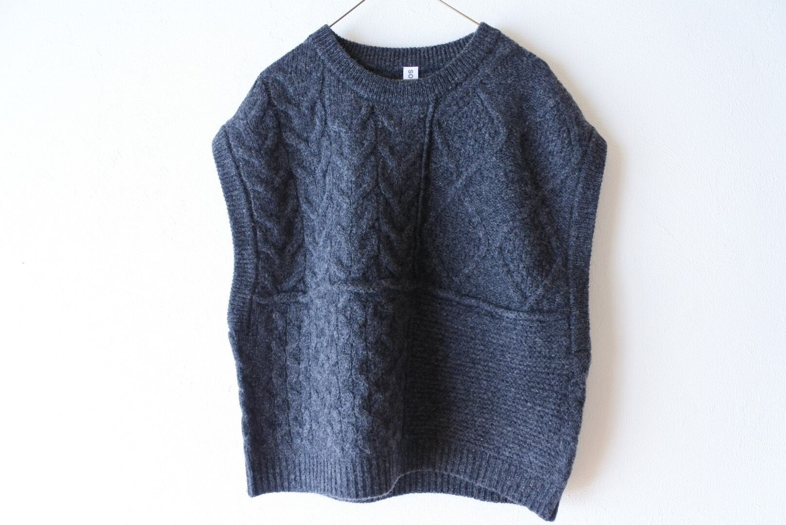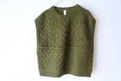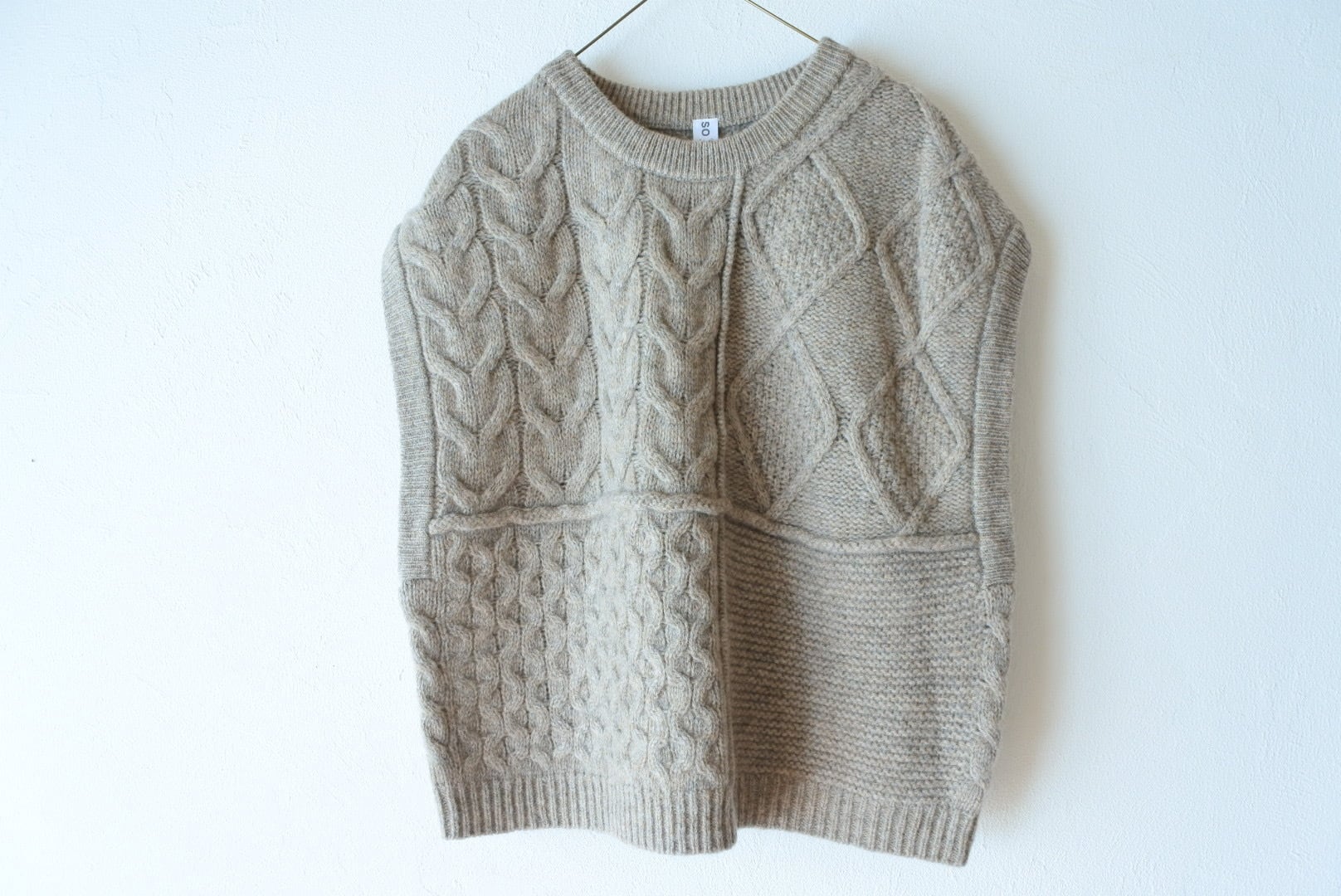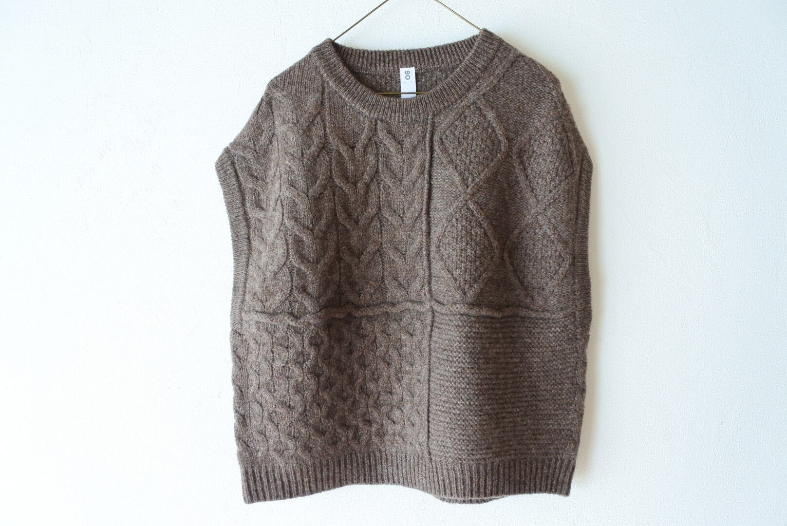 いろいろなアラン柄をパネルのように接ぎ合わせたベストです。つい手に取ってしまう、ワクワクしてしまう1枚に仕上がりました。