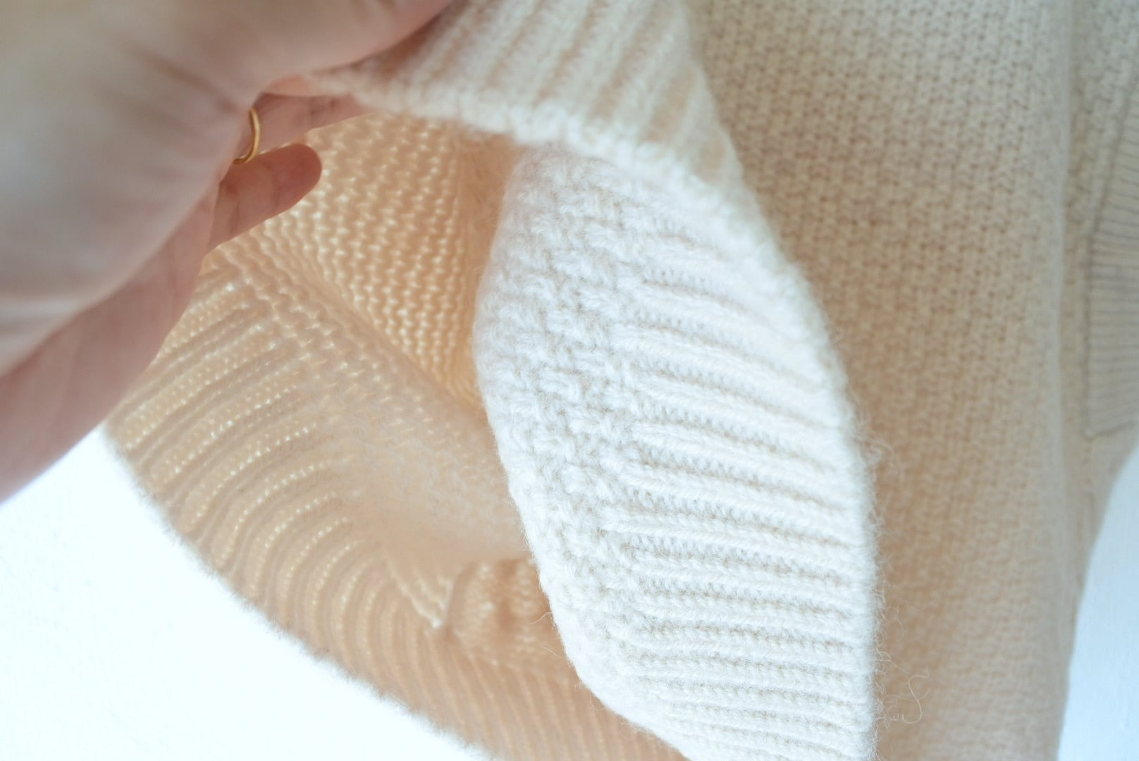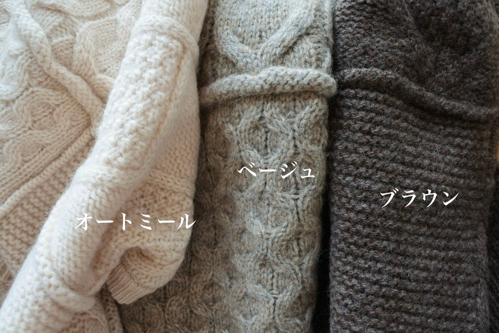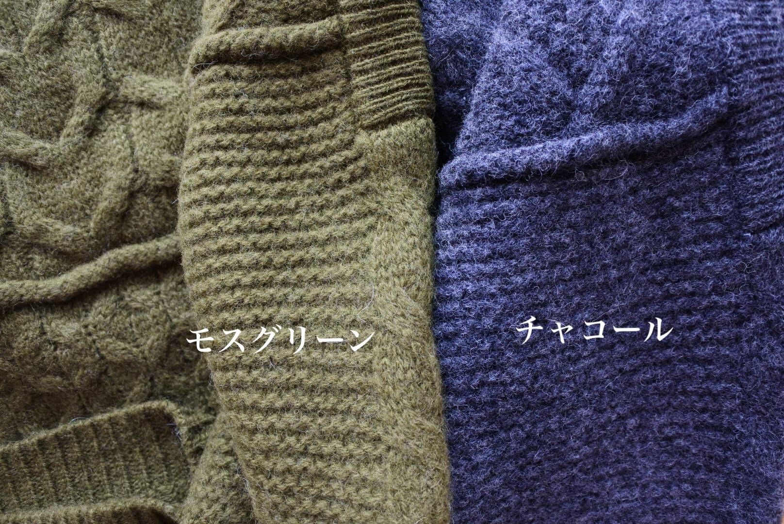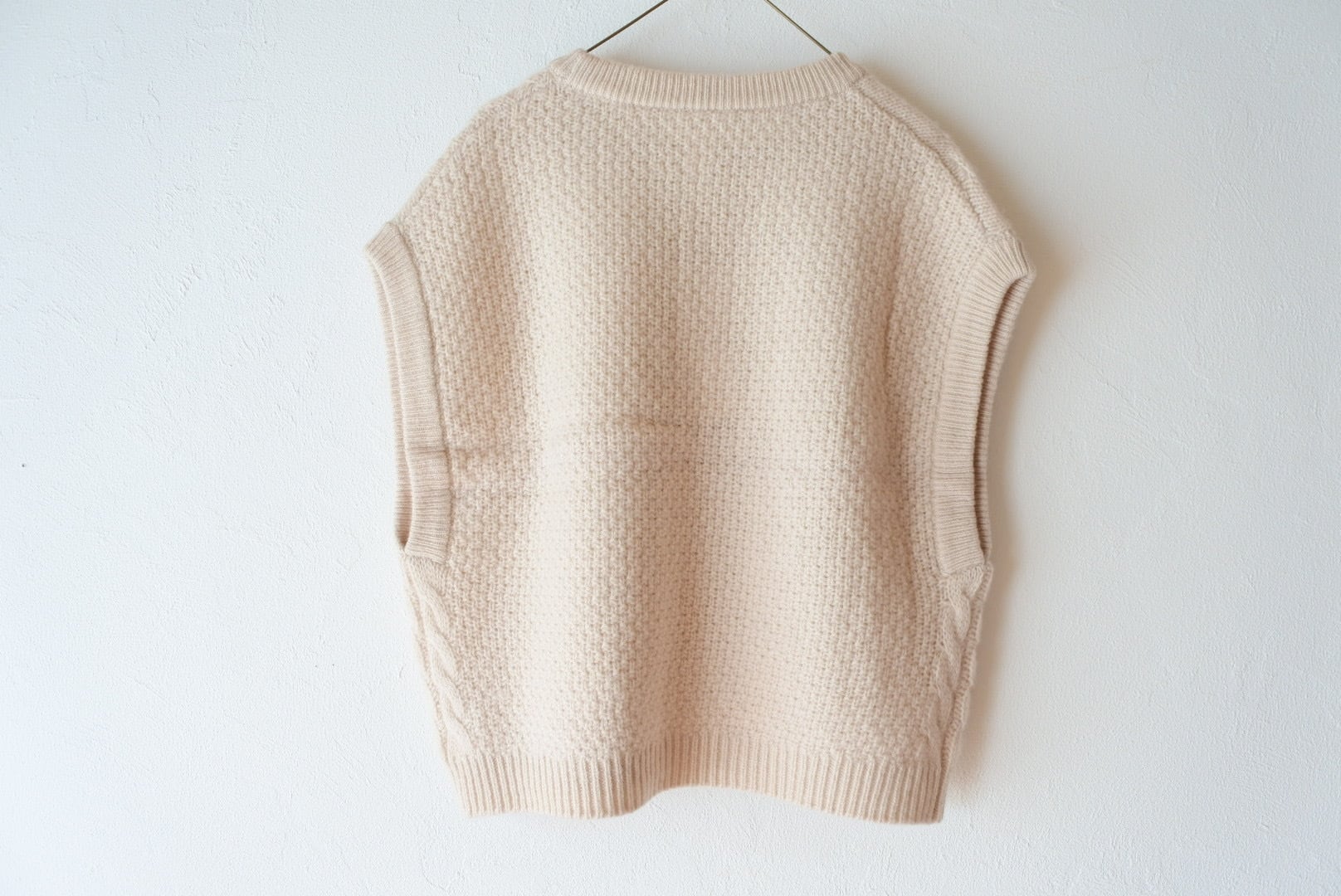 いろいろなアラン柄をパネルのように接ぎ合わせたベストです。つい手に取ってしまう、ワクワクしてしまう1枚に仕上がりました。