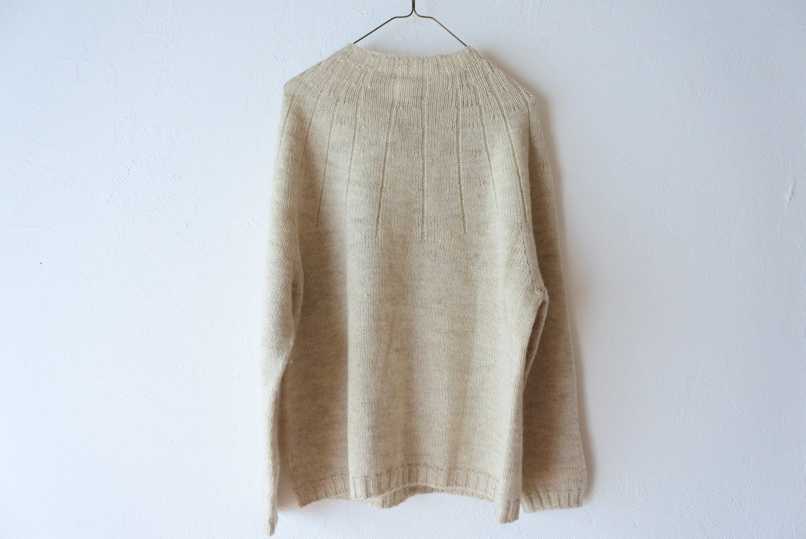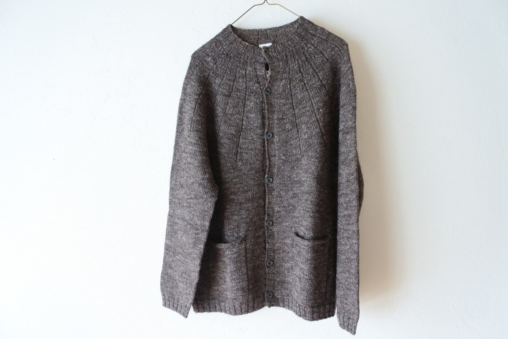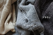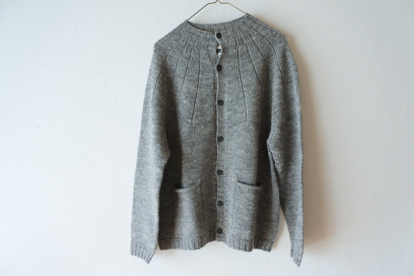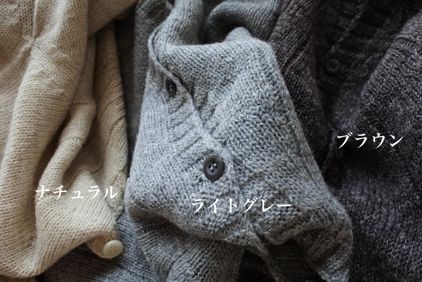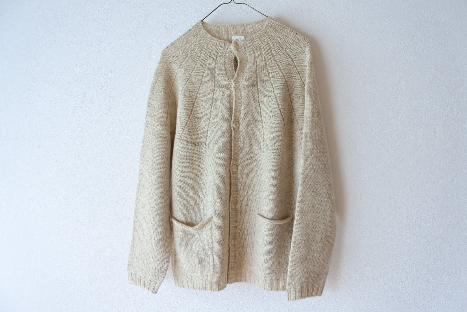 胸元の求心編みがポイントのカーディガンです。シンプルなシルエットですが、素材も相まったナチュラルな雰囲気が特徴です。デザインのポイントとなるよう、少し大きめの四角いポケットをつけました。