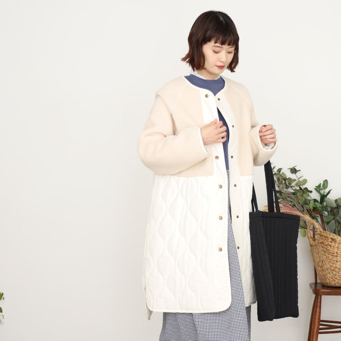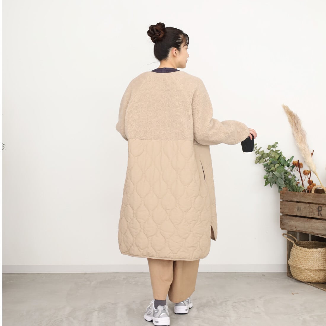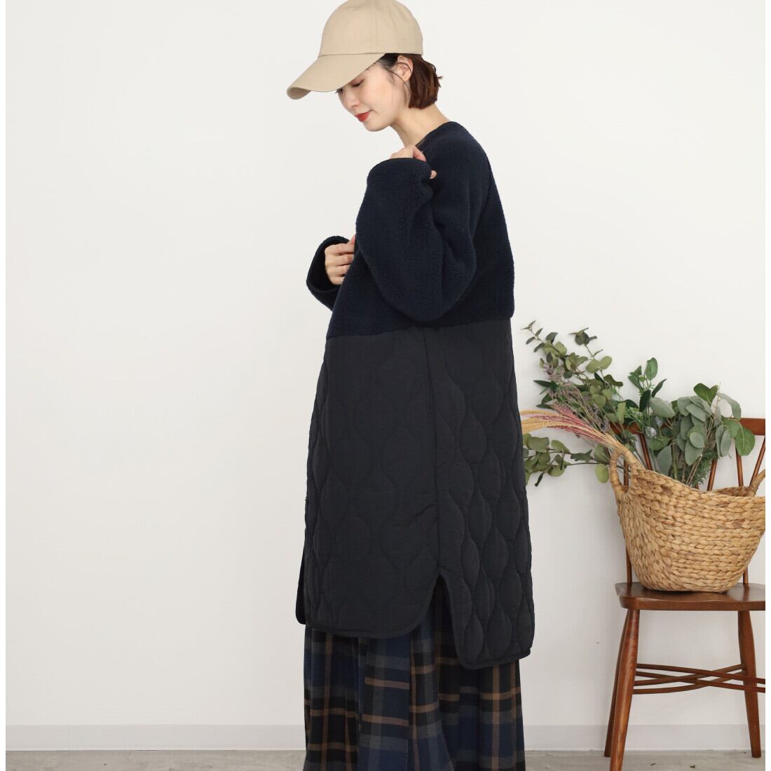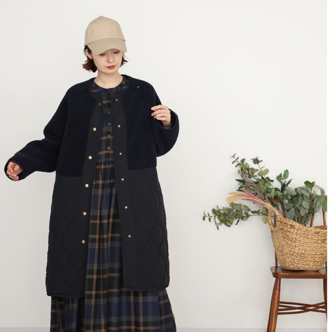 キルティングとボアの切り替えがアクセント。ノーカラーデザインで、顔周りはすっきりに見せながら、タートルネックやハイネックのアイテムとも合わせやすい。サイドスリットが抜け感をプラス。程よくゆとりのあるサイズ感で、厚手のトップスとも合わせやすくコーデの幅が広がります。