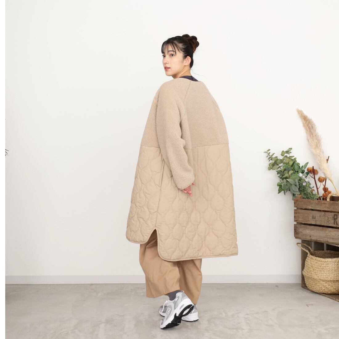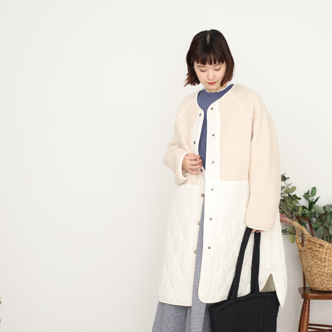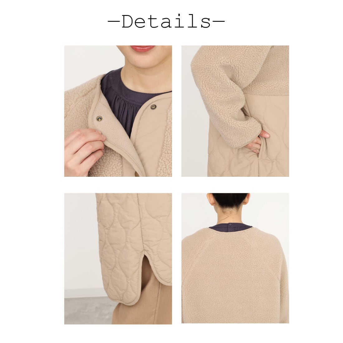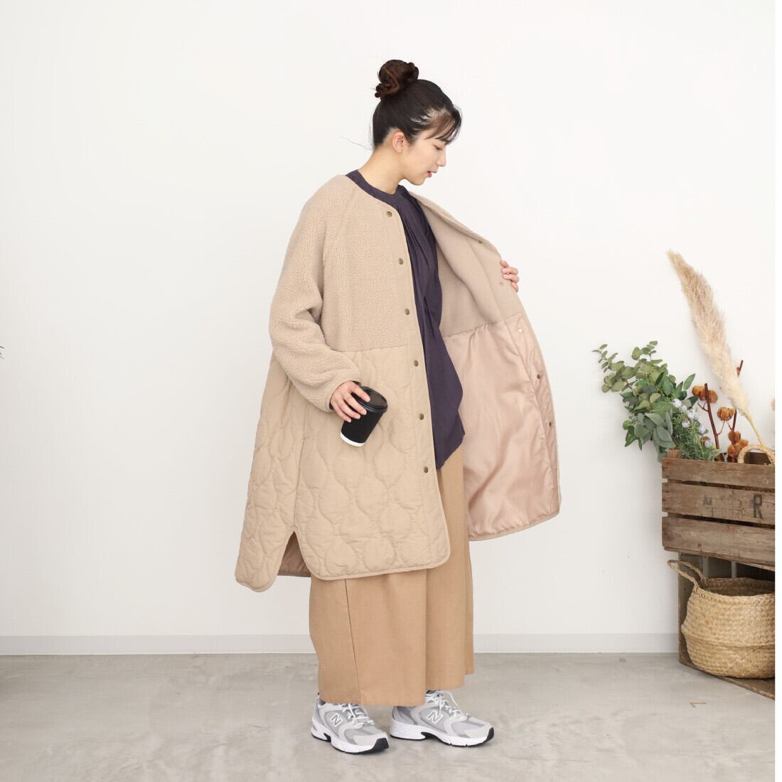 キルティングとボアの切り替えがアクセント。ノーカラーデザインで、顔周りはすっきりに見せながら、タートルネックやハイネックのアイテムとも合わせやすい。サイドスリットが抜け感をプラス。程よくゆとりのあるサイズ感で、厚手のトップスとも合わせやすくコーデの幅が広がります。