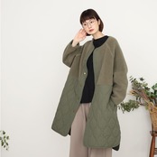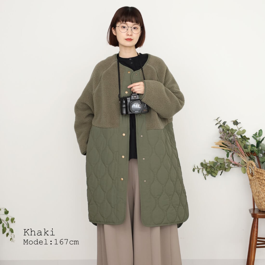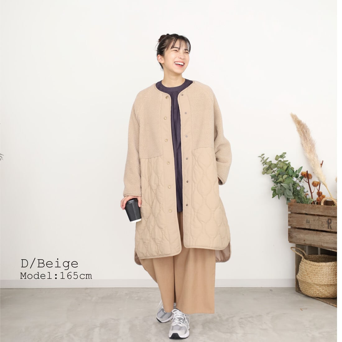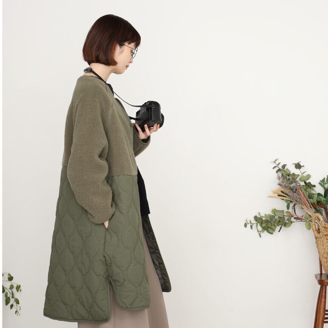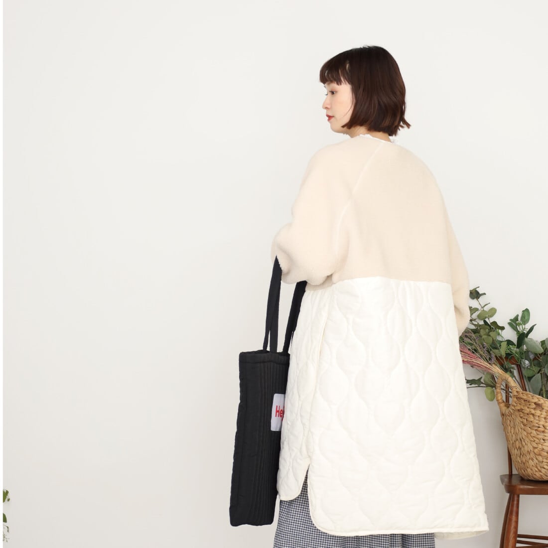 キルティングとボアの切り替えがアクセント。ノーカラーデザインで、顔周りはすっきりに見せながら、タートルネックやハイネックのアイテムとも合わせやすい。サイドスリットが抜け感をプラス。程よくゆとりのあるサイズ感で、厚手のトップスとも合わせやすくコーデの幅が広がります。