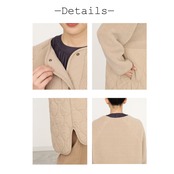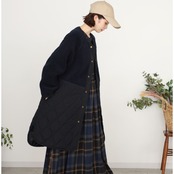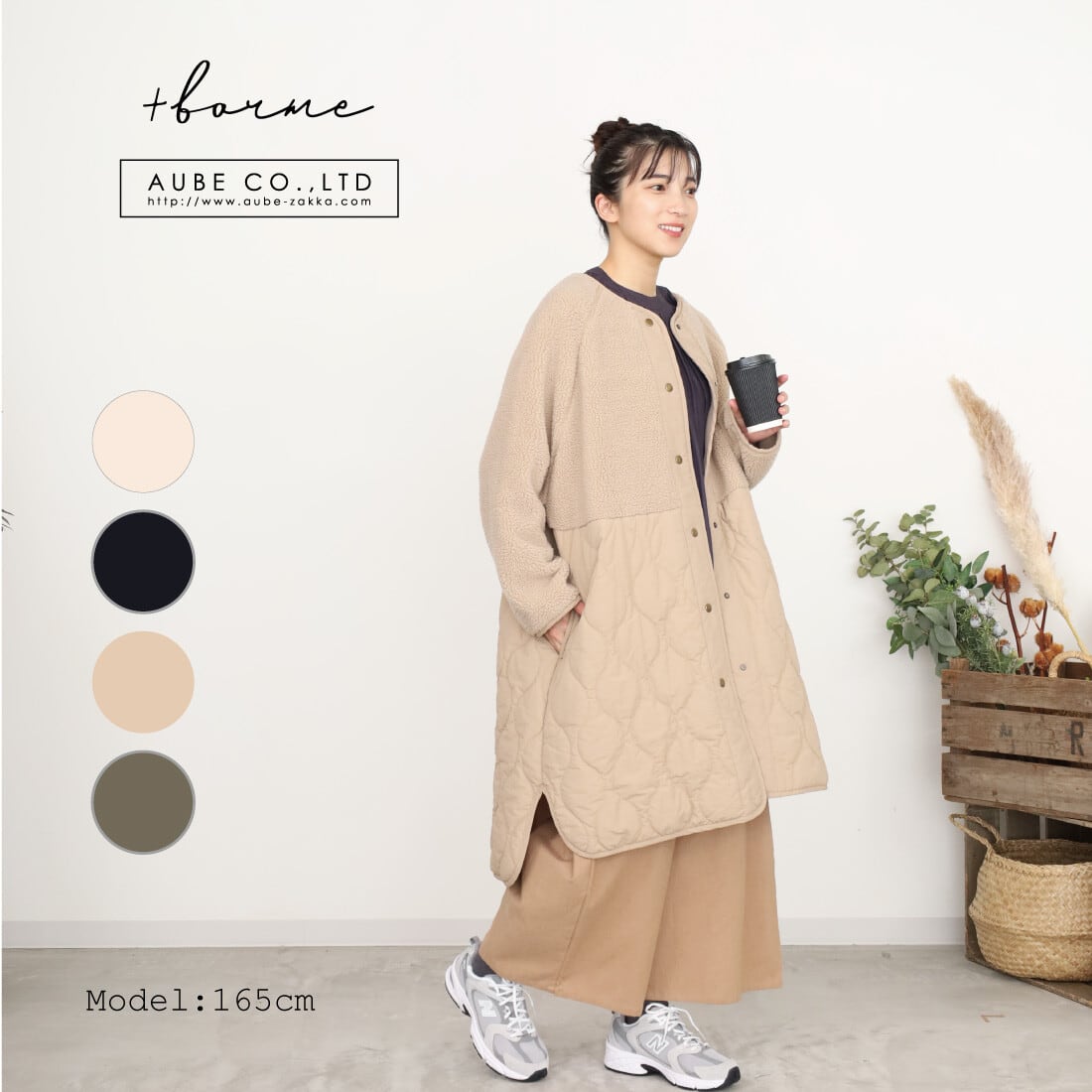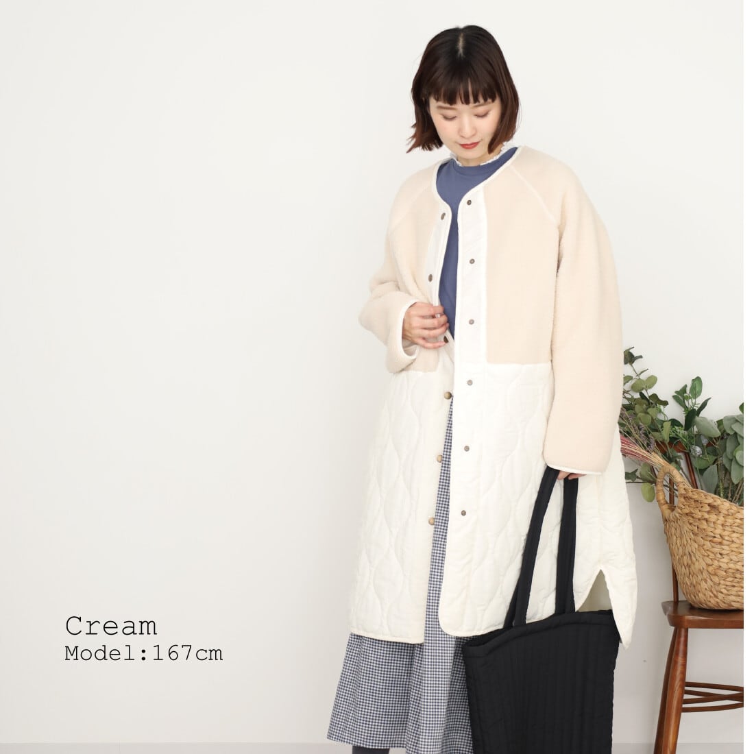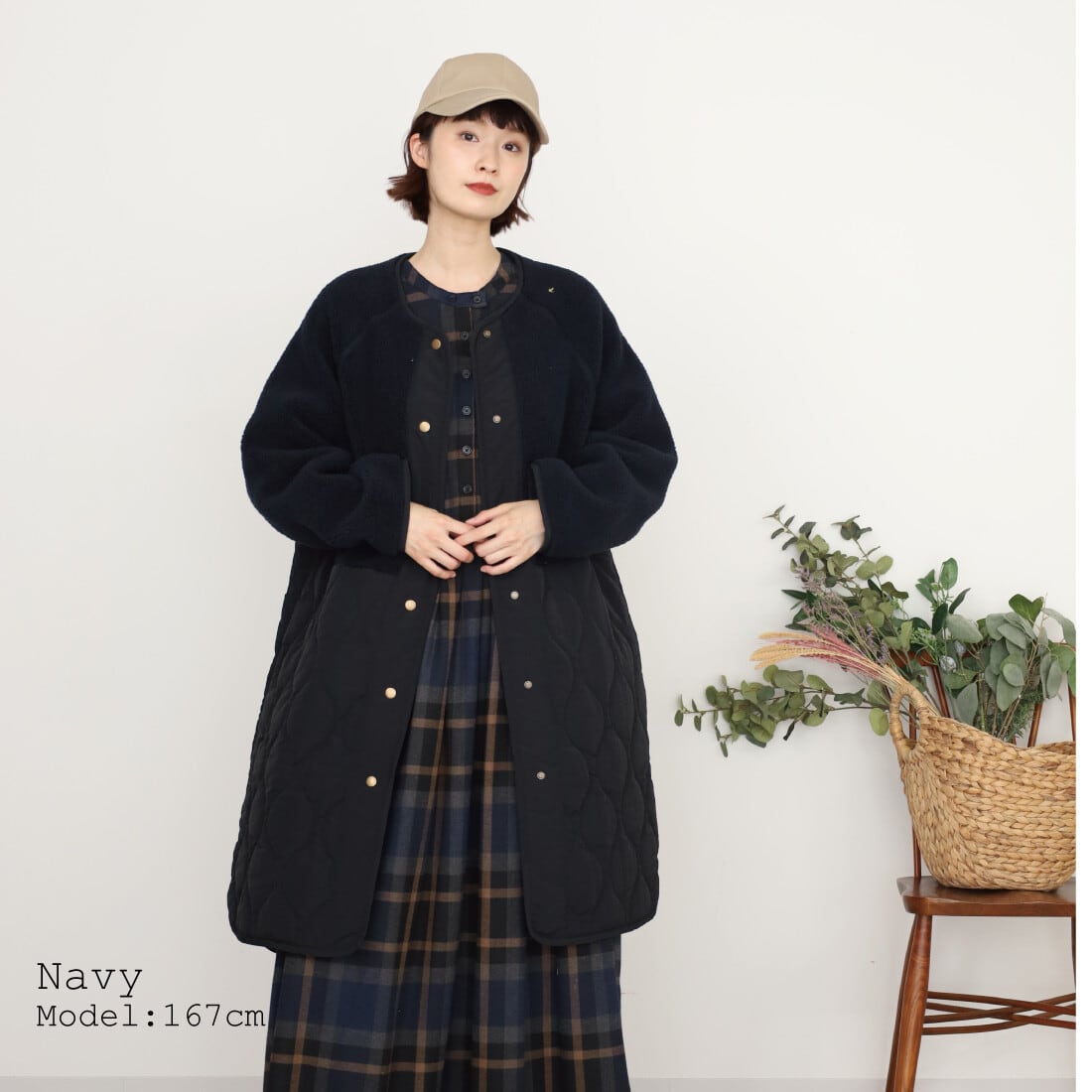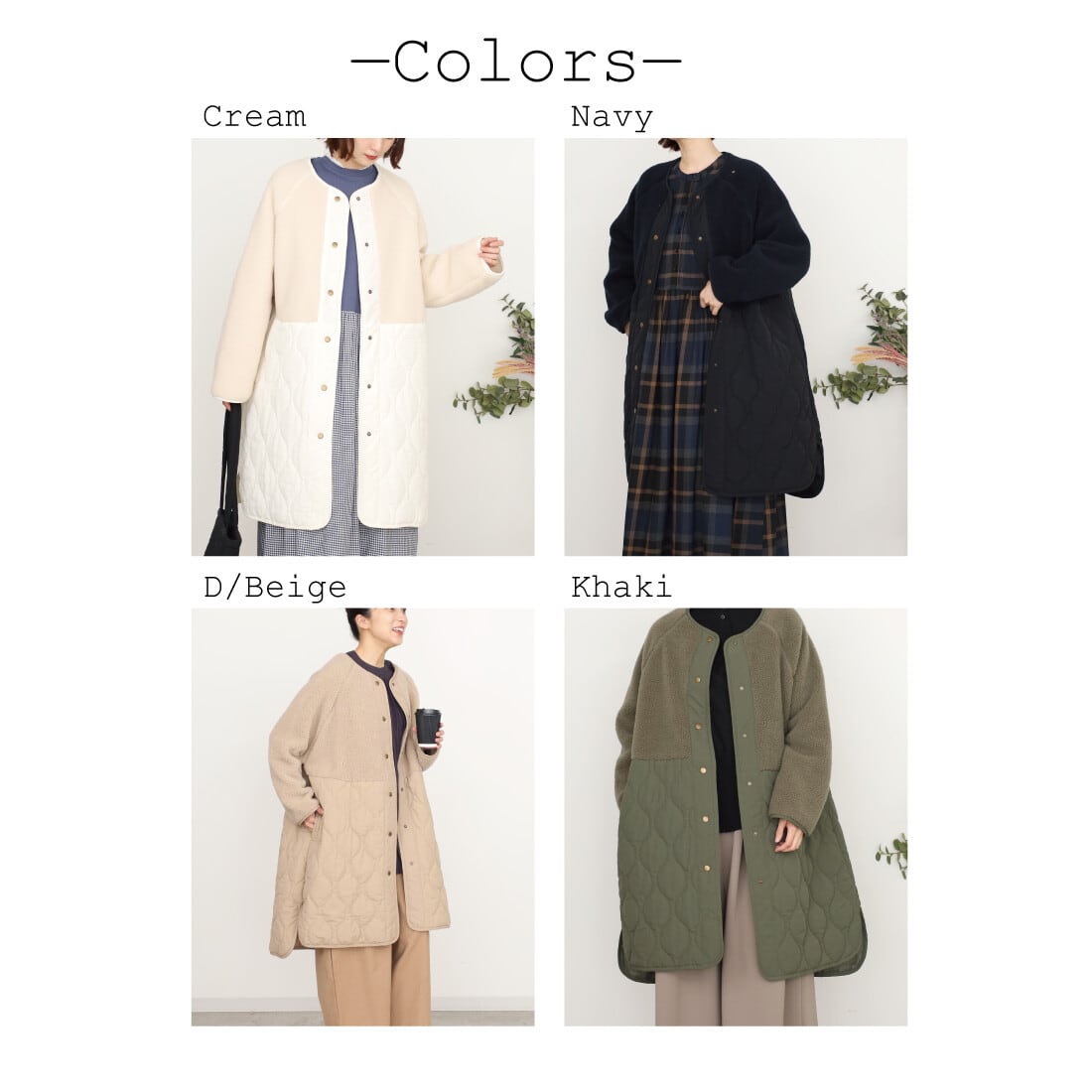 キルティングとボアの切り替えがアクセント。ノーカラーデザインで、顔周りはすっきりに見せながら、タートルネックやハイネックのアイテムとも合わせやすい。サイドスリットが抜け感をプラス。程よくゆとりのあるサイズ感で、厚手のトップスとも合わせやすくコーデの幅が広がります。