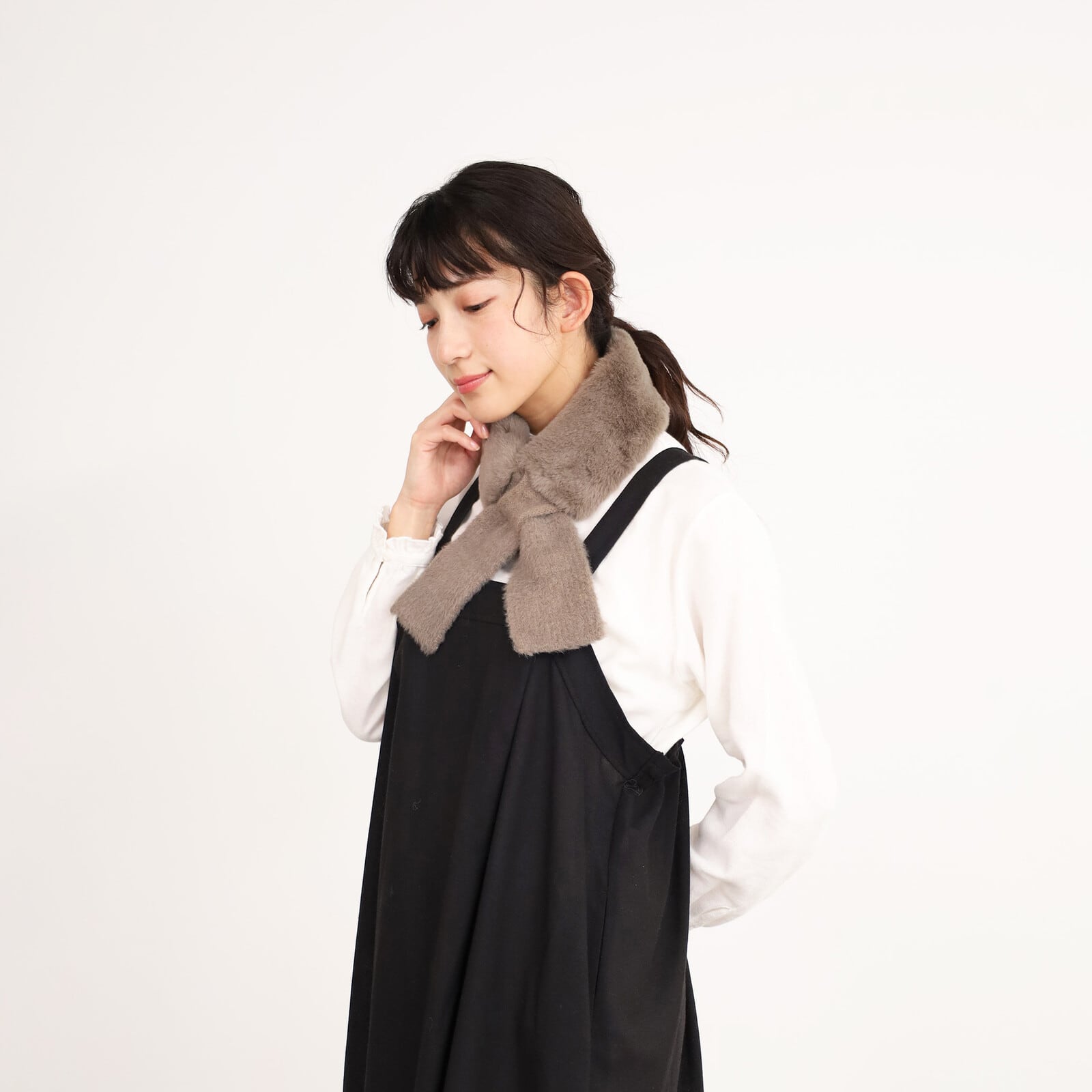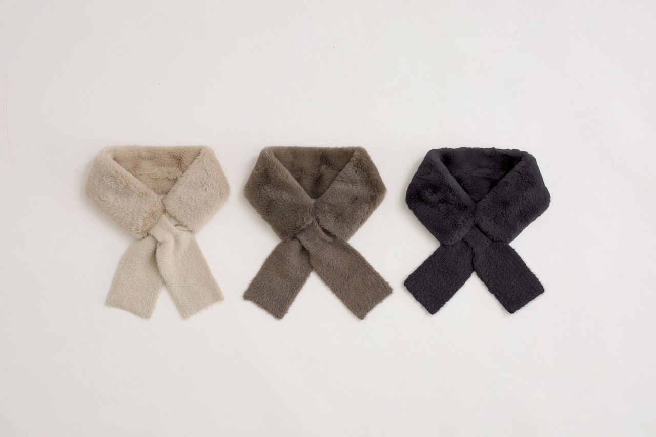 着こなしに華やかなアクセントを添えるニット×ファーのマフラー。コンパクトなサイズ感でかわいい。