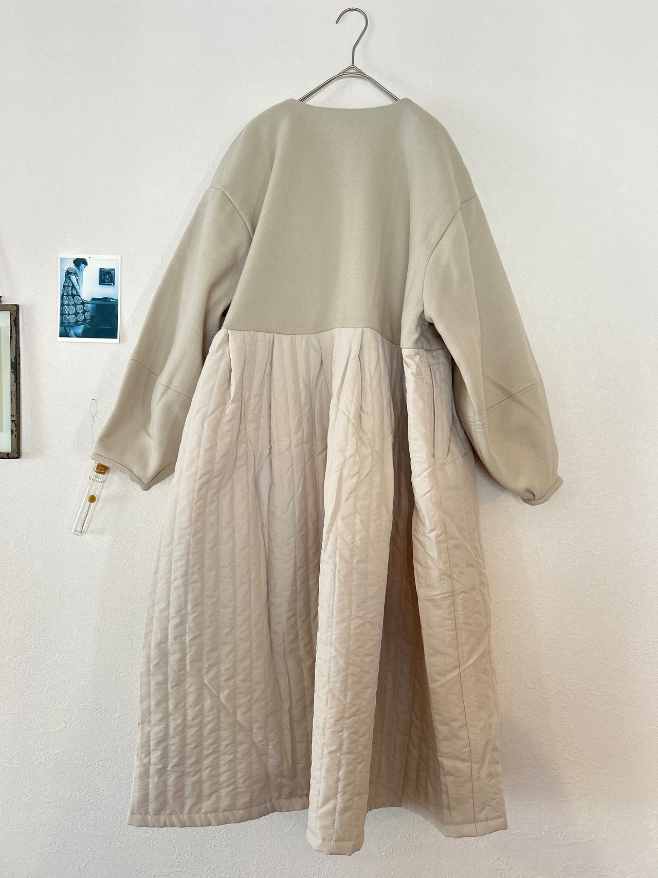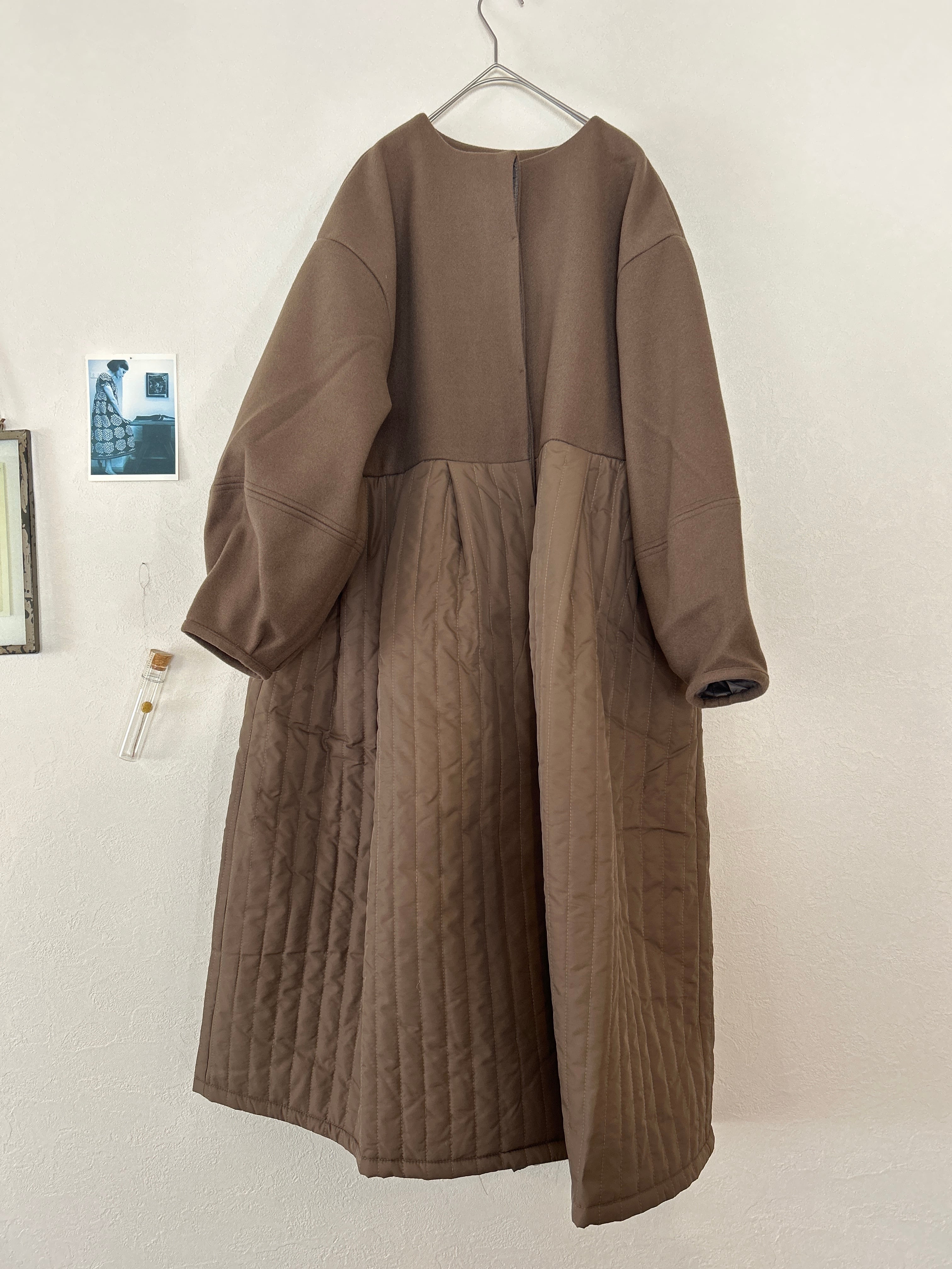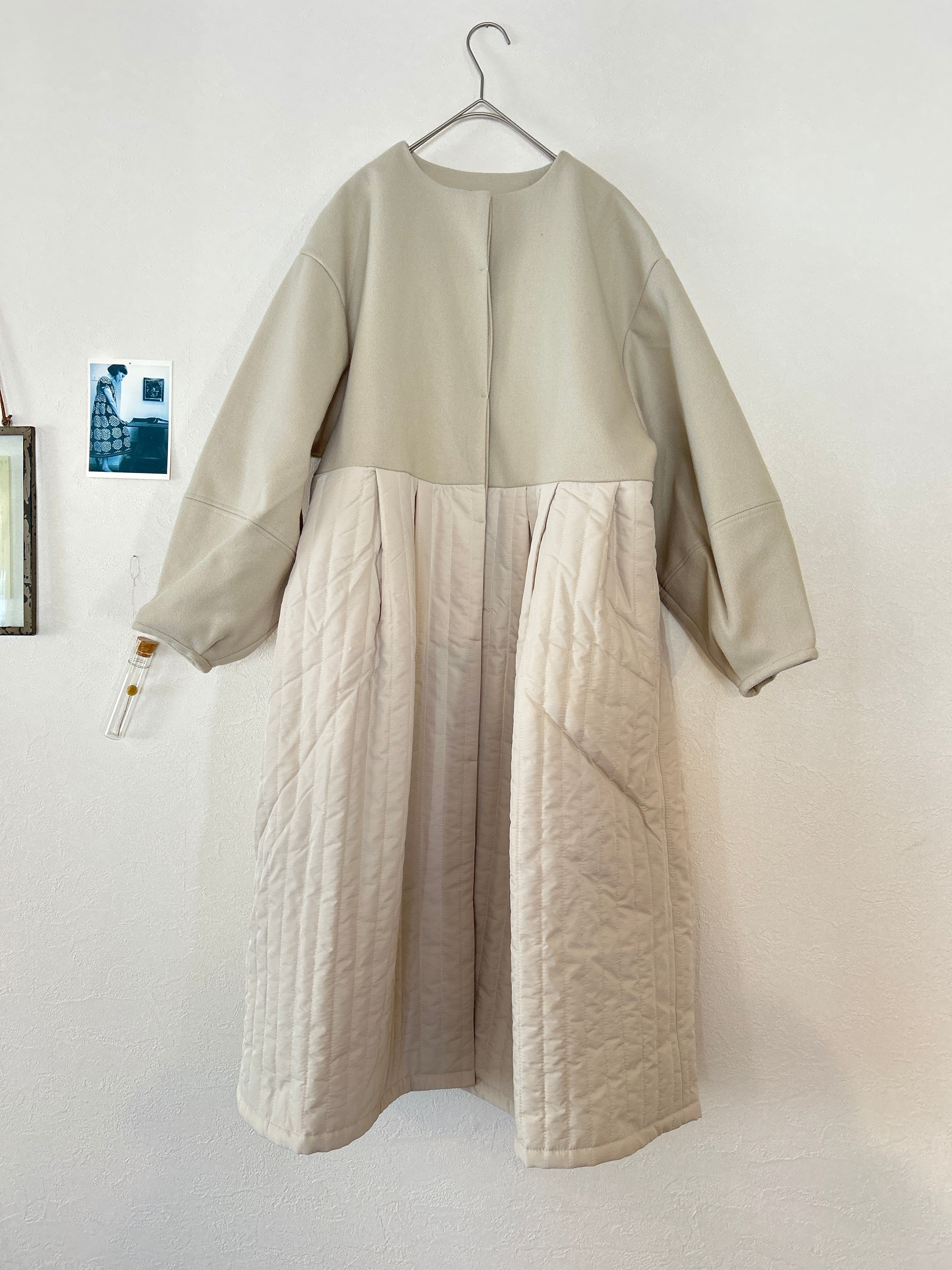 コート レディース アウター ノーカラー Aライン ロング丈 ボタン ボリューム袖 10分袖 長袖 無地 ポケット 裏地あり フェイクウール ウール キルト地 キルティング ペプラム 大人カジュアル 高見え 肌触り 定番デザイン 上質 体型カバー 着やせ 着回し 大人の定番 華奢見え