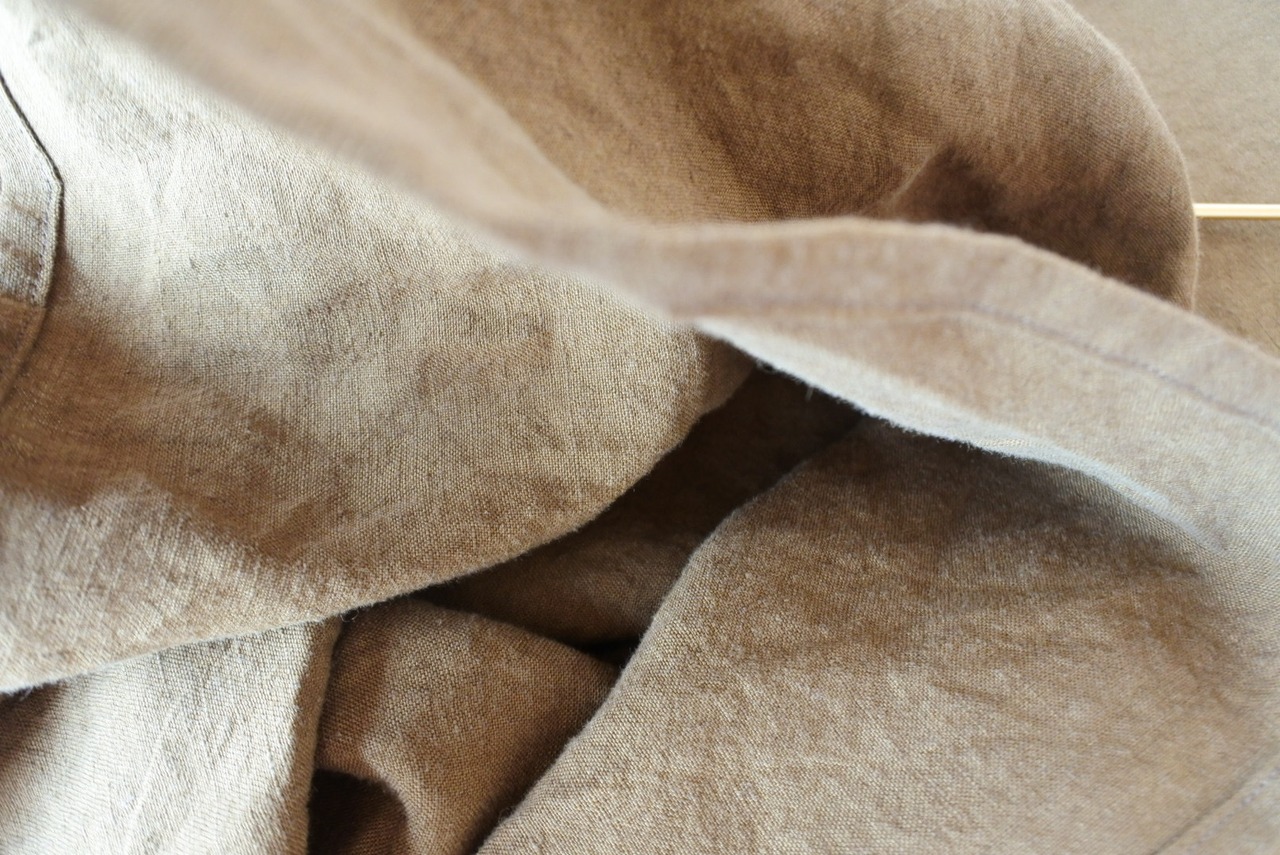 リネン素材の特徴として、植物の茎部分などの原料が入ってしまう場合があります。無理に取ろうとすると、糸切れを起こす恐れがございますので、リネン素材の特有として、ご理解下さい。