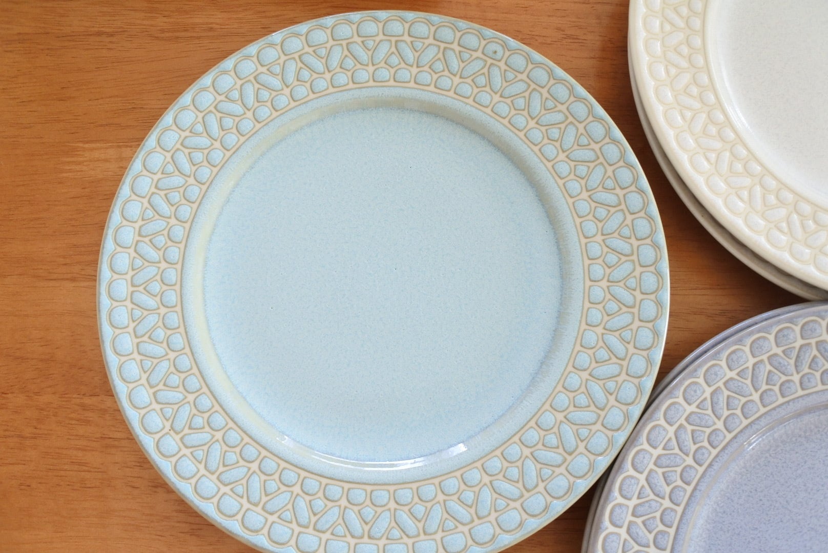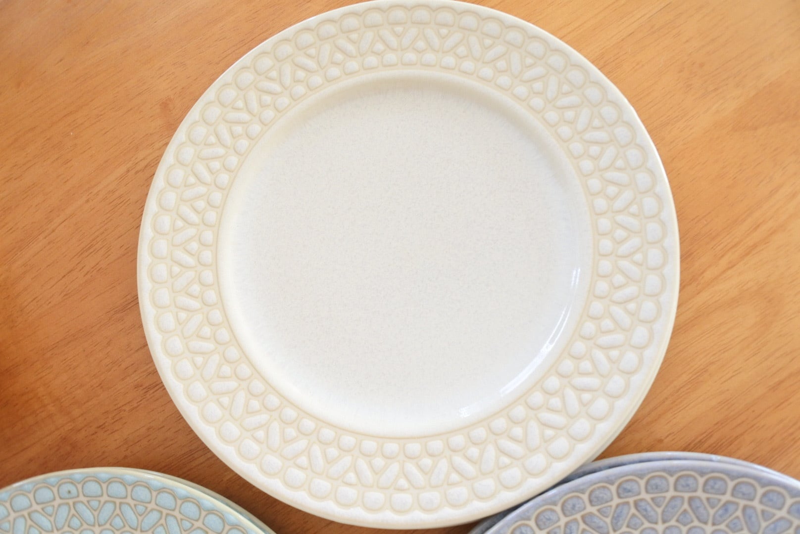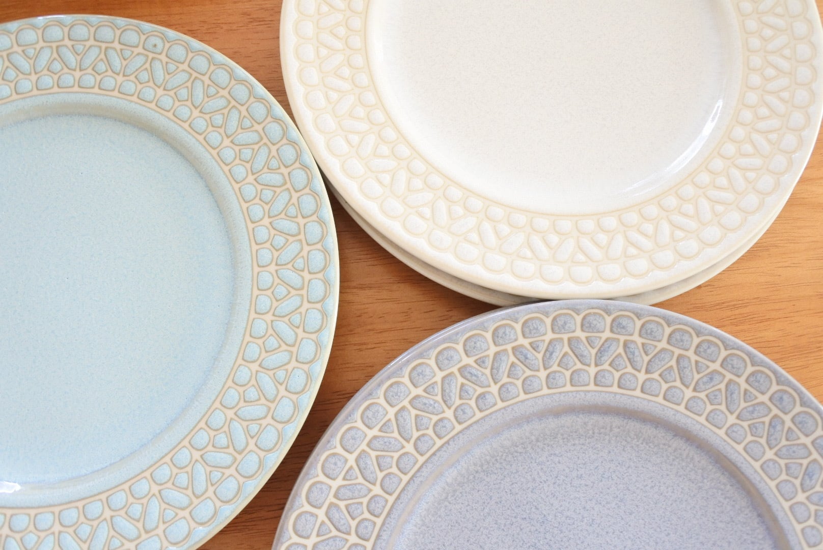 渕の柄は、ぷっくりと立体感があり、大人可愛いアンティーク調の雰囲気を演出してくれます。見た目も可愛く、手ざわりも飽きの来ない器です。