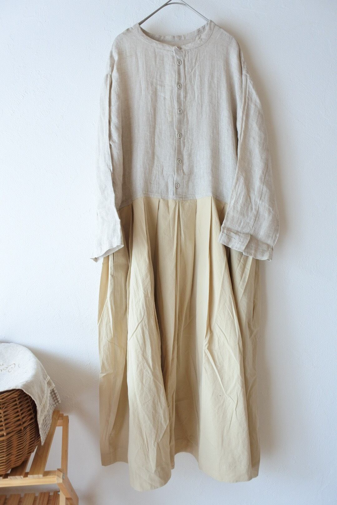 天然素材を使った、長袖のドッキングワンピースです。ブラウス部分が麻素材でスカート部分が綿素材の1枚で完結する楽ちんで可愛い時短アイテムです。