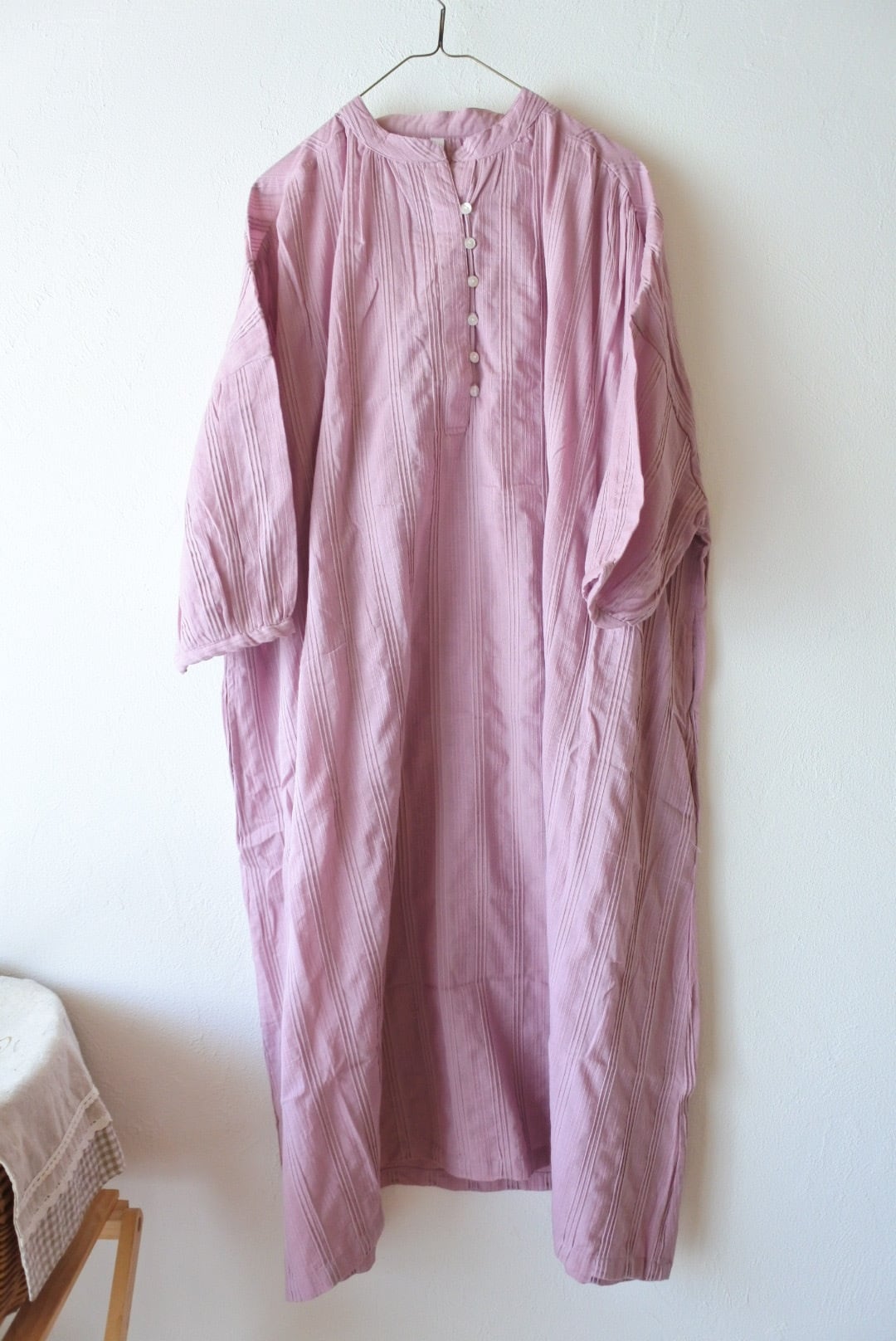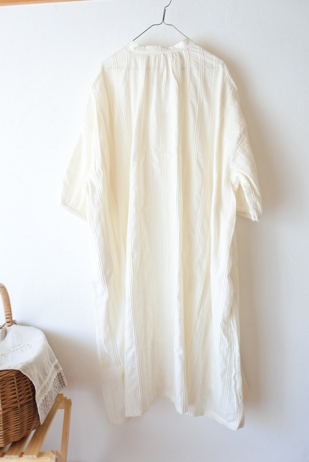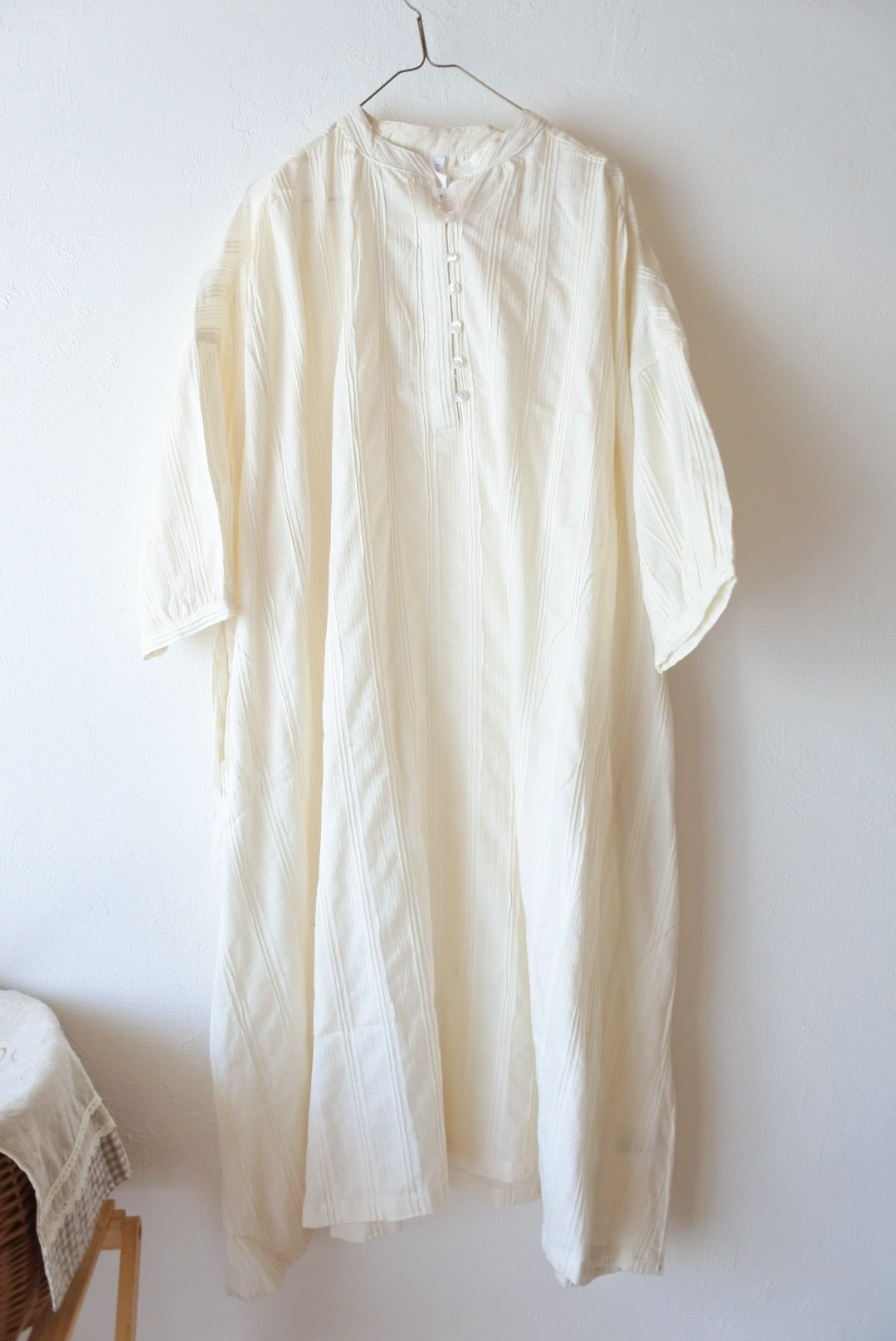 インド綿ワンピース / タックドビー / フロントボタン / 前開きワンピース / ワイドワンピース / ドビー織り / 幾何学模様 / ナチュラルスタイル / リラックスシルエット / 通気性抜群 / コットン100 / エスニックモダン / 体型カバー / 春夏アウター / 羽織り