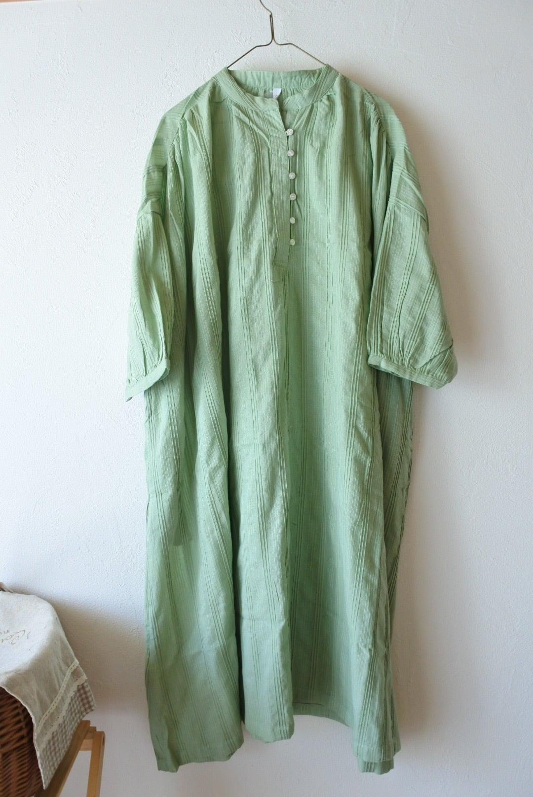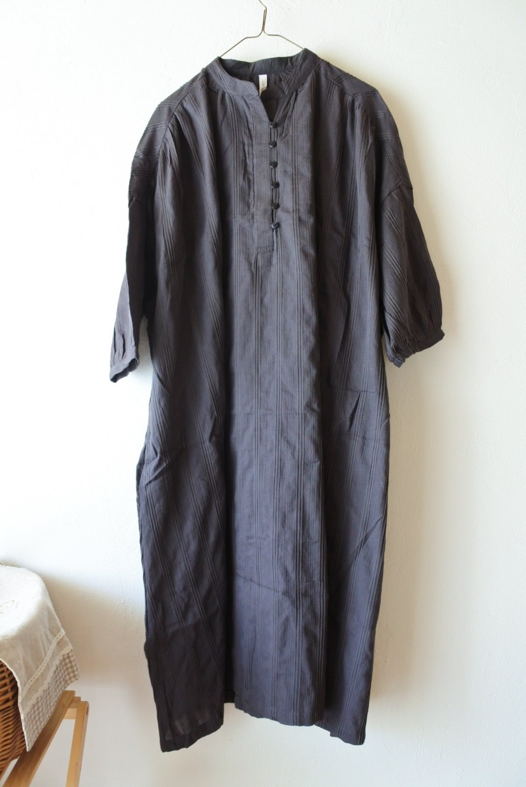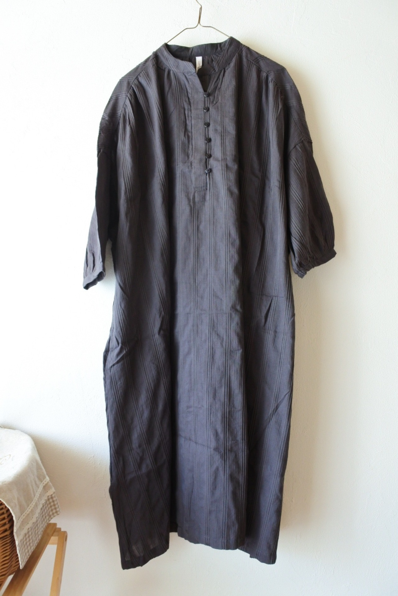 インド綿ワンピース / タックドビー / フロントボタン / 前開きワンピース / ワイドワンピース / ドビー織り / 幾何学模様 / ナチュラルスタイル / リラックスシルエット / 通気性抜群 / コットン100 / エスニックモダン / 体型カバー / 春夏アウター / 羽織り