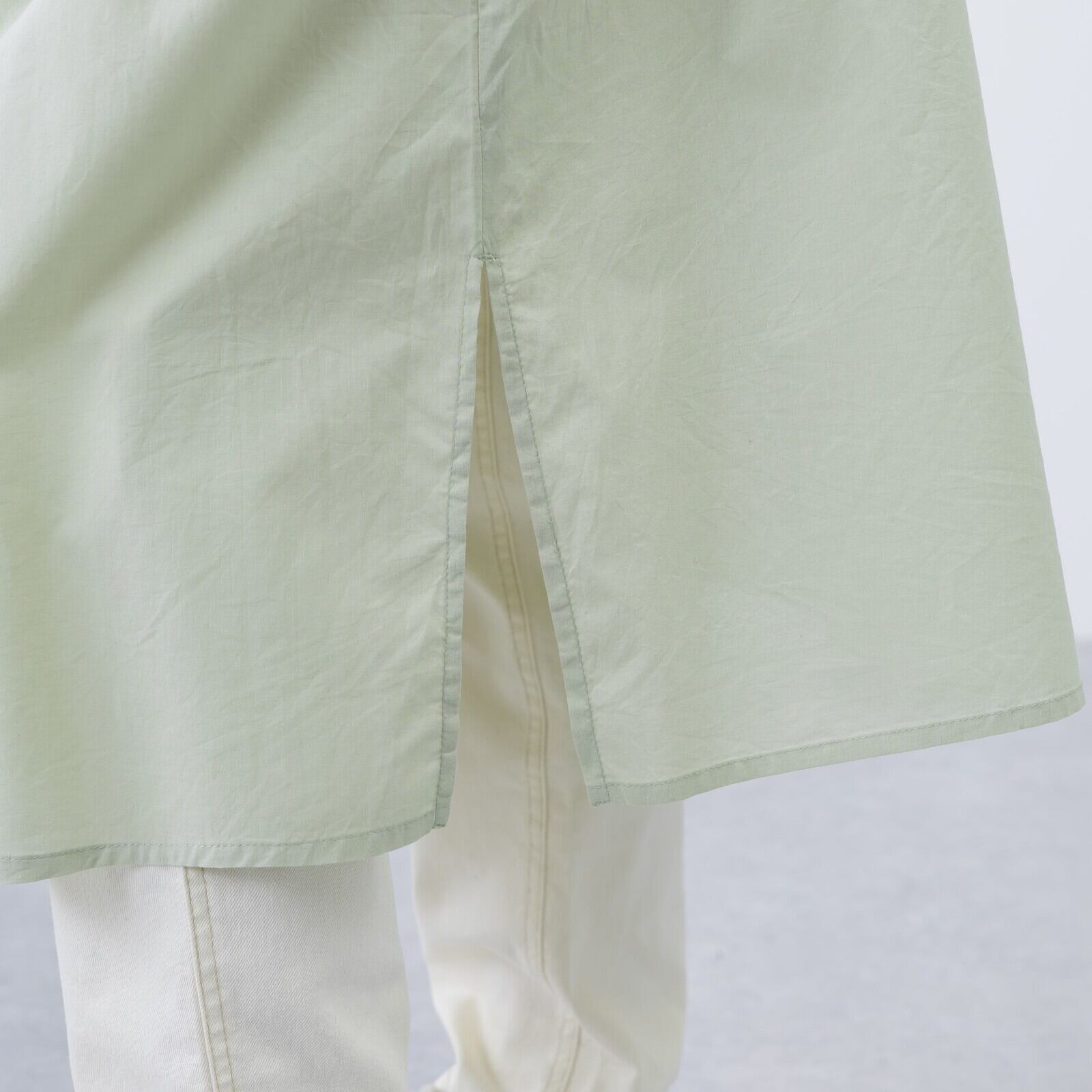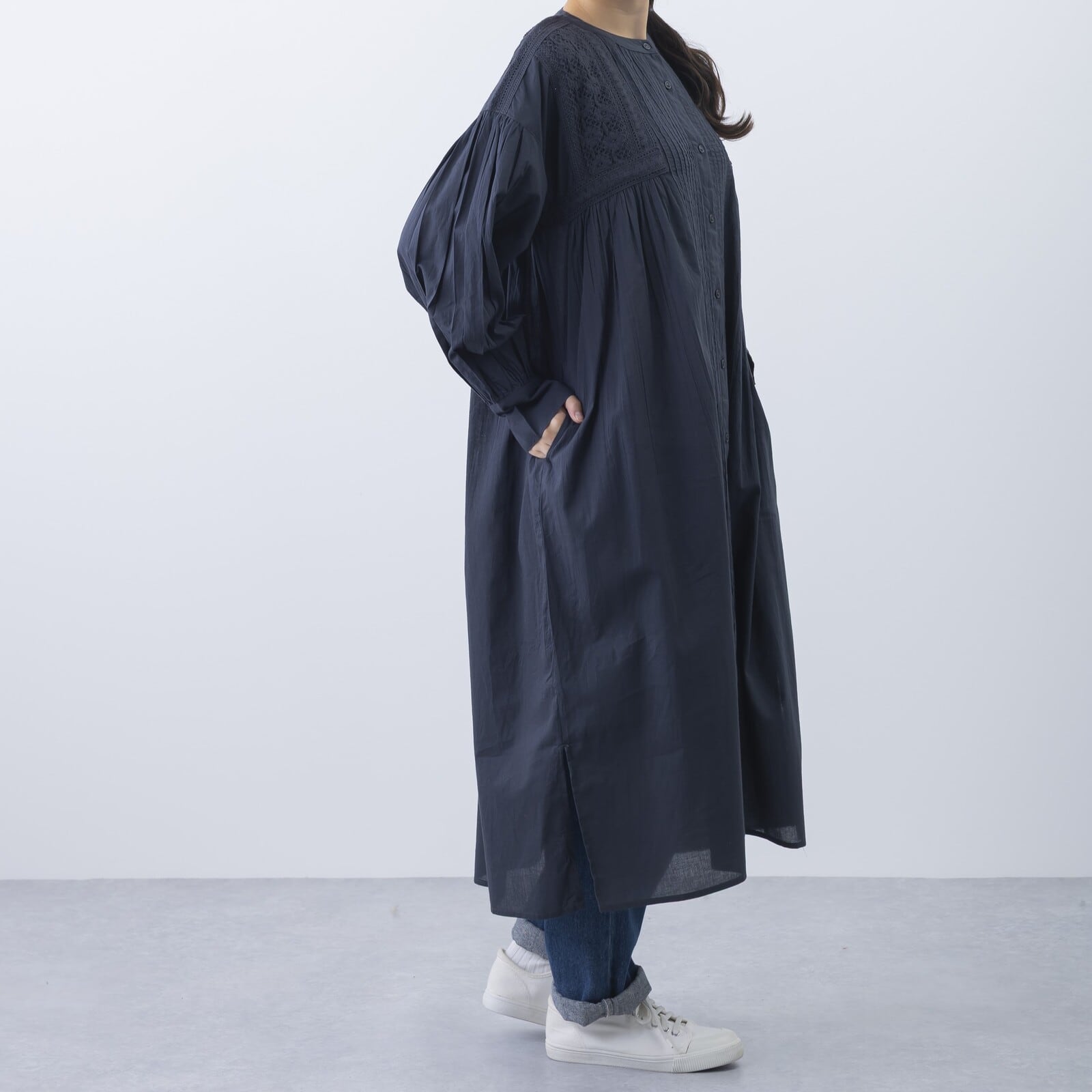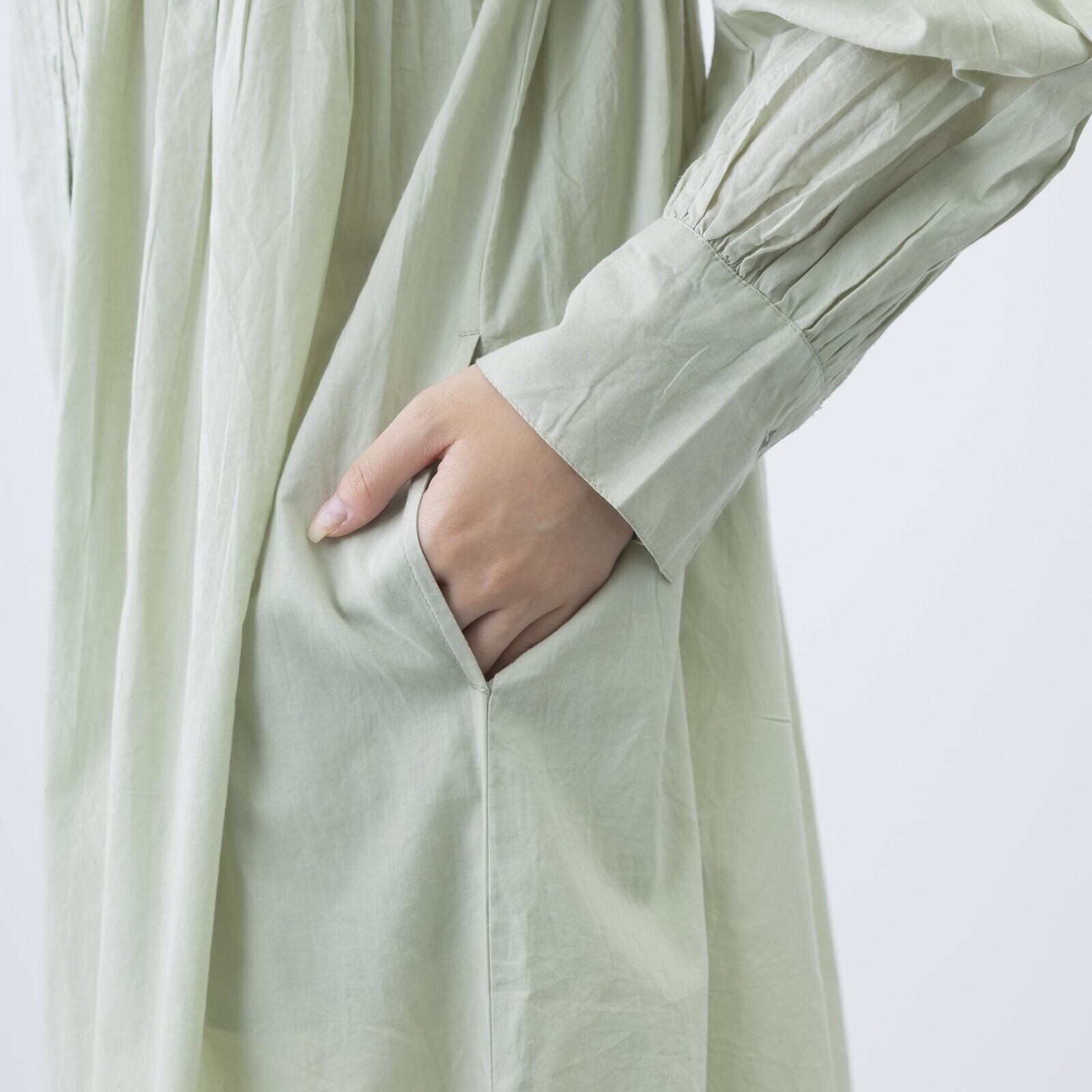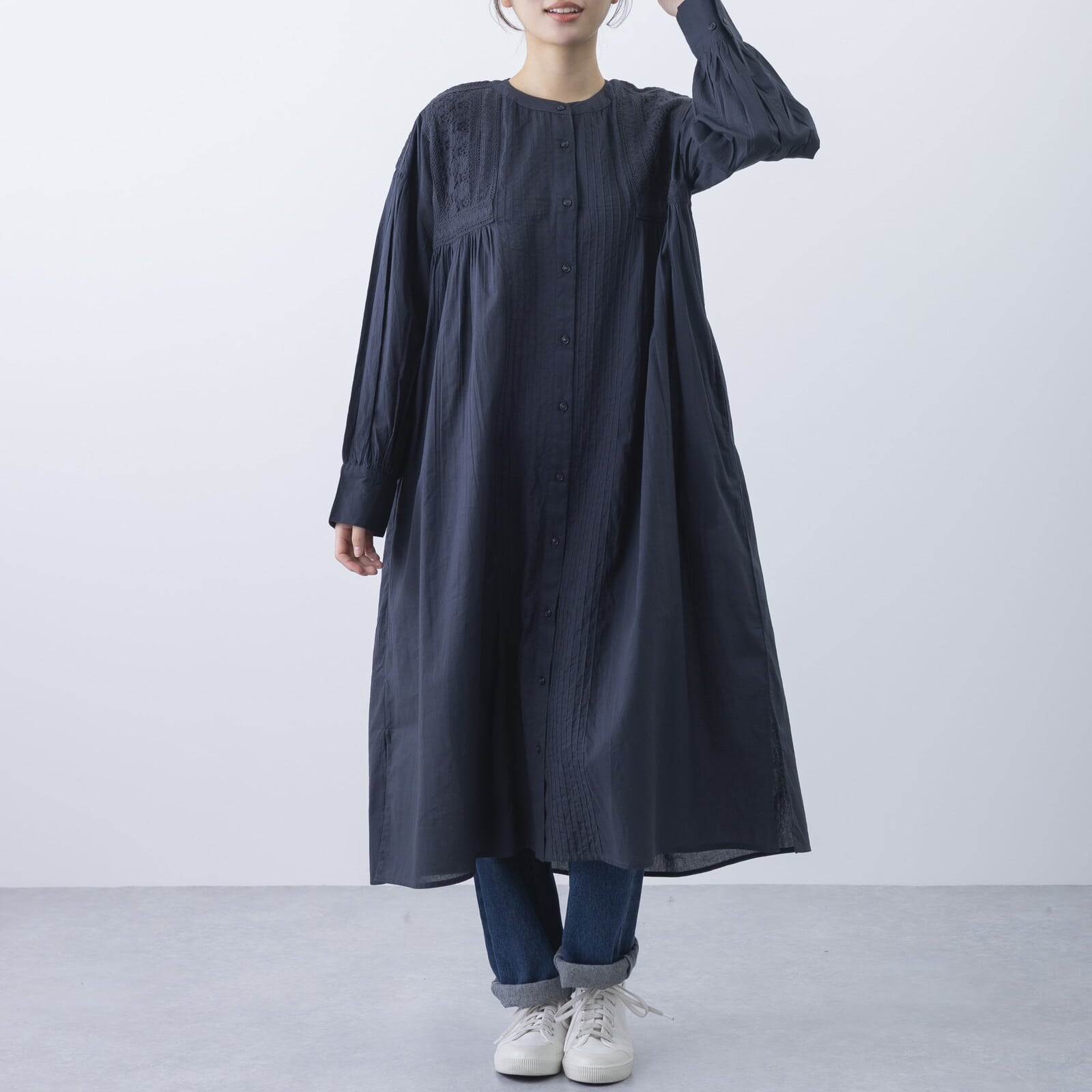 ゆったりとしたシルエットながら、胸元から裾にかけたピンタックが縦のラインを強調し、スッキリと見せてくれます。肌に心地よい素材感で、春〜秋口まで日よけや冷房対策としても活躍するアイテムです。
