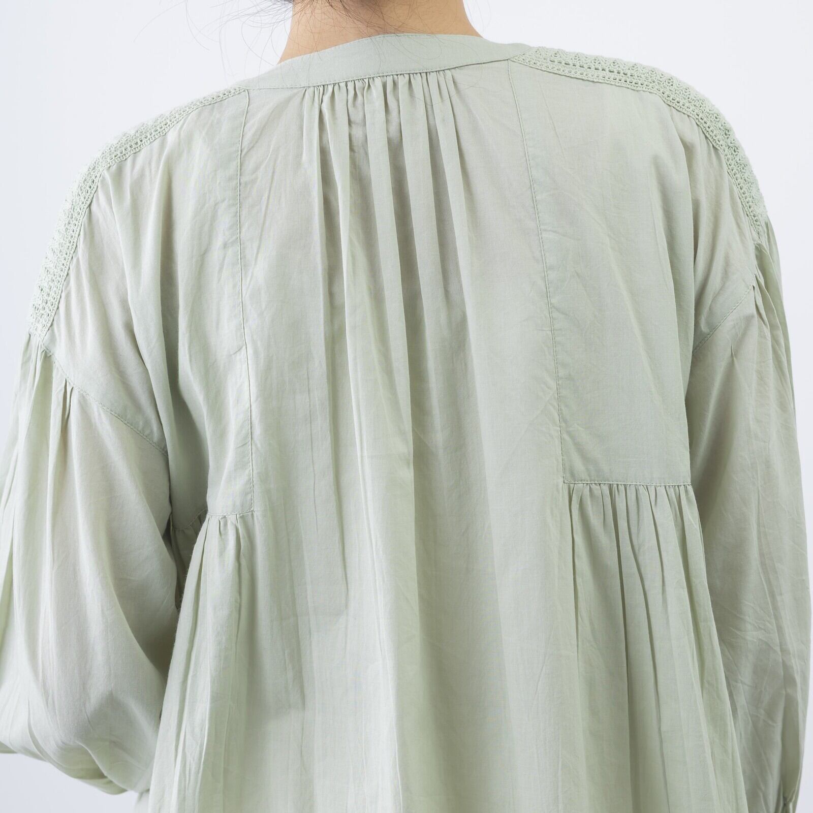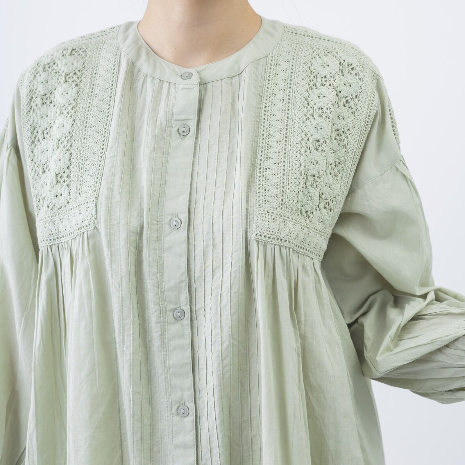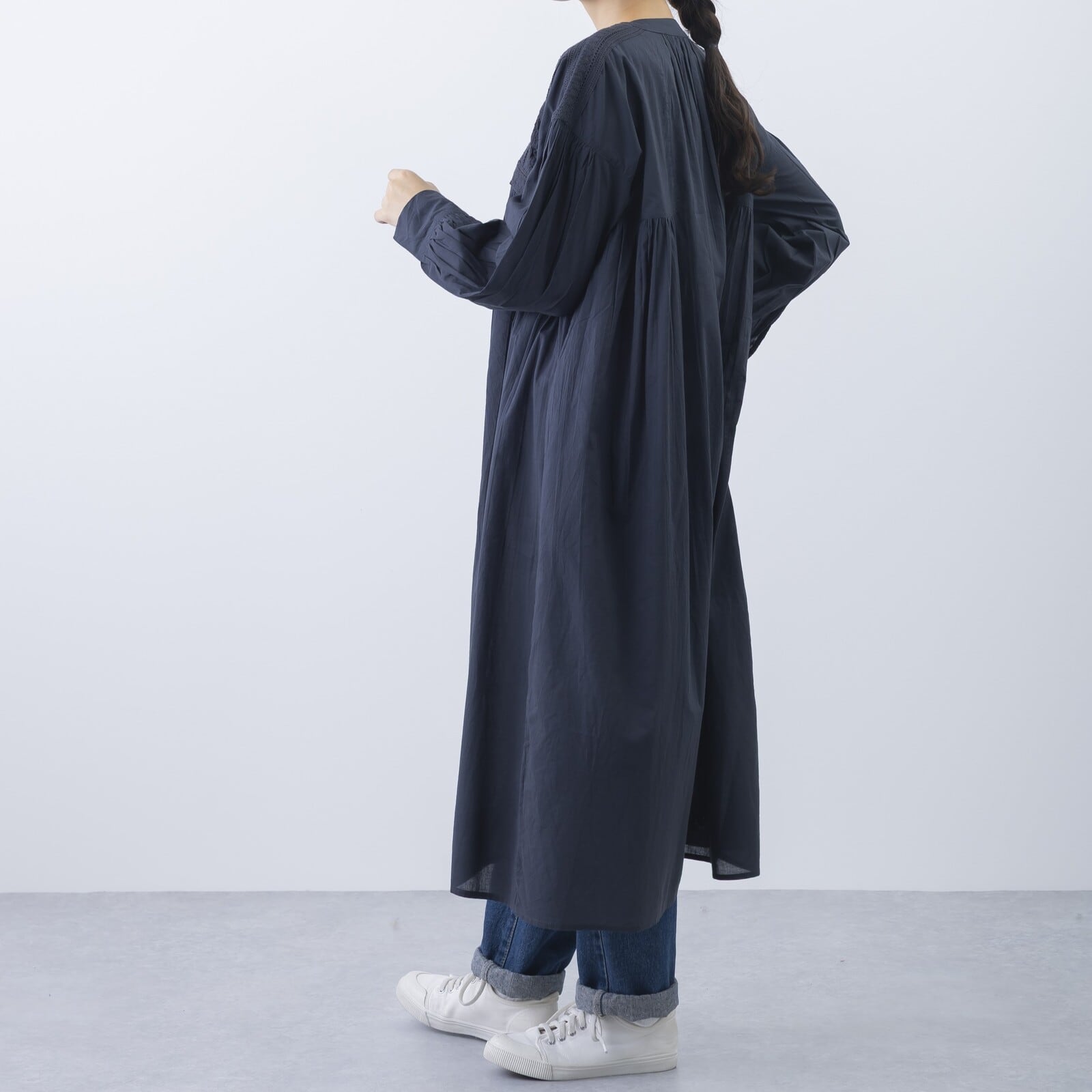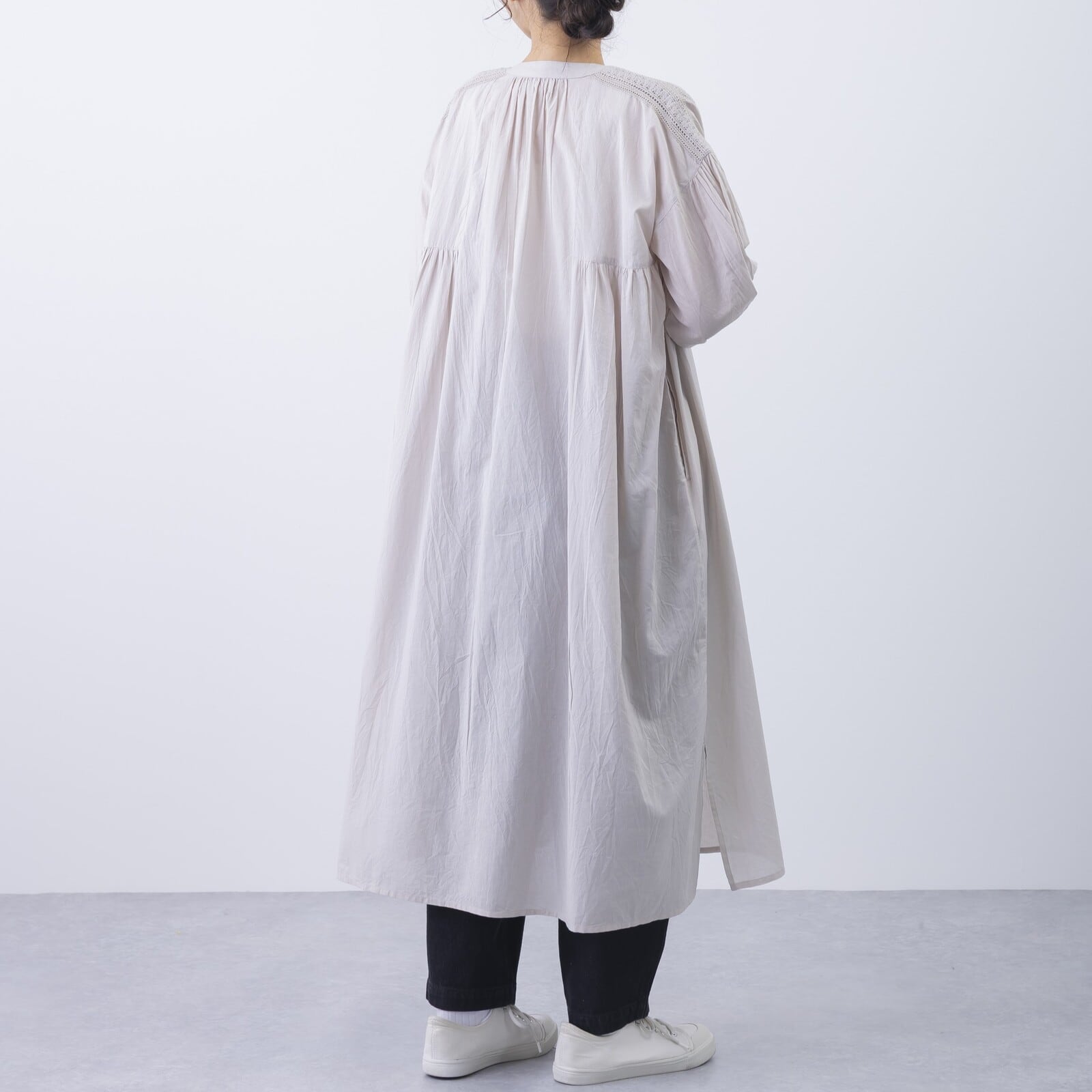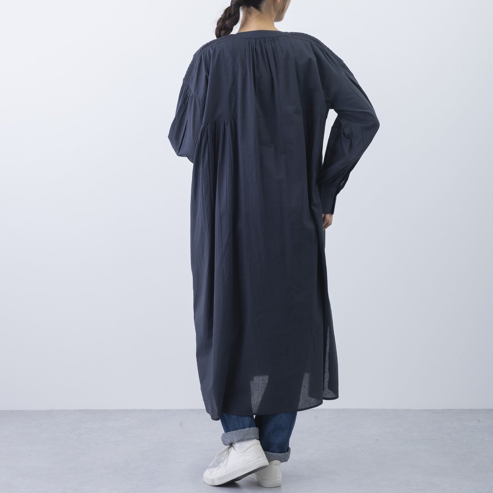 ゆったりとしたシルエットながら、胸元から裾にかけたピンタックが縦のラインを強調し、スッキリと見せてくれます。肌に心地よい素材感で、春〜秋口まで日よけや冷房対策としても活躍するアイテムです。