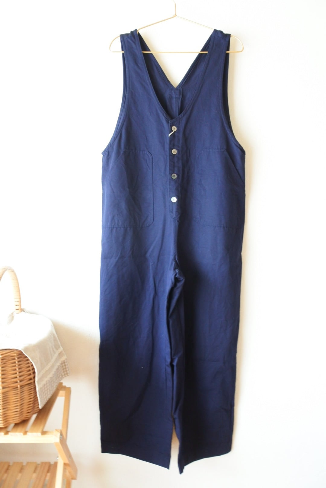 胸当て部分のボタンや大き目のポケットもアクセントに。シンプルながら存在感のあるデザインは、年齢問わず着用していただけます。インナーを変えれば季節問わず着ていただけて1枚あると便利なアイテムです。