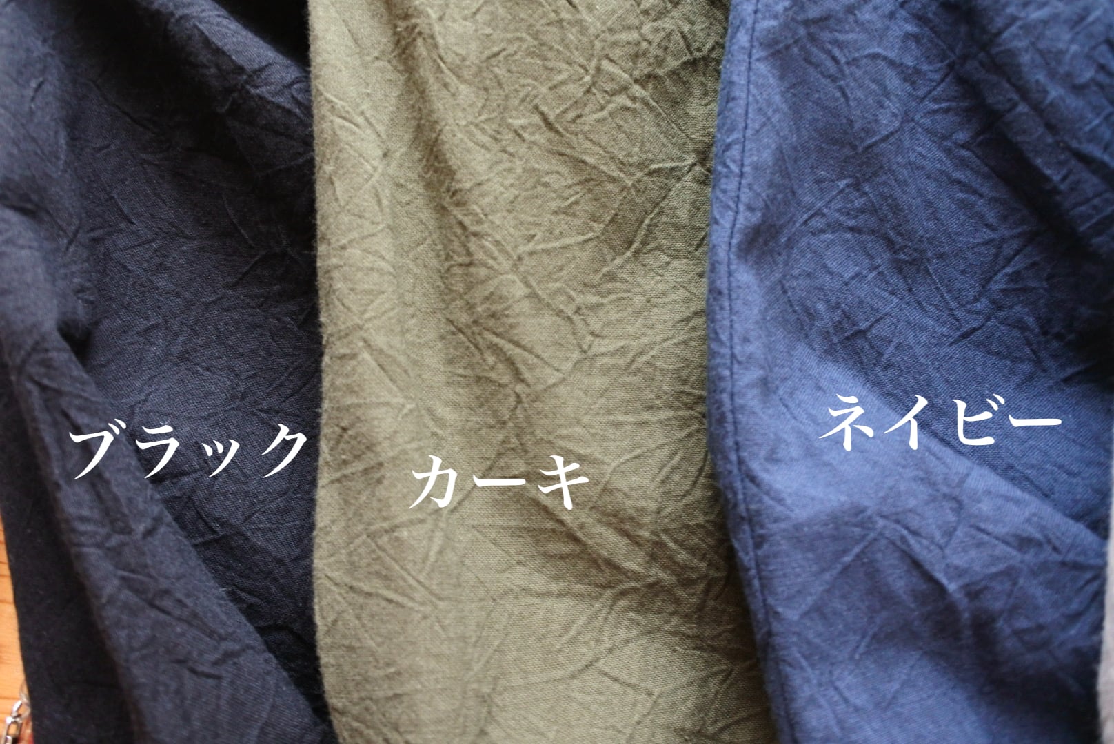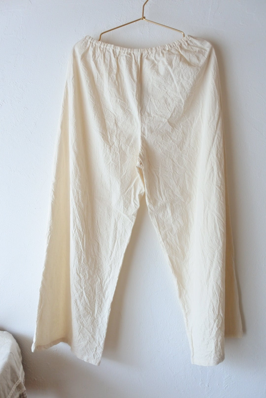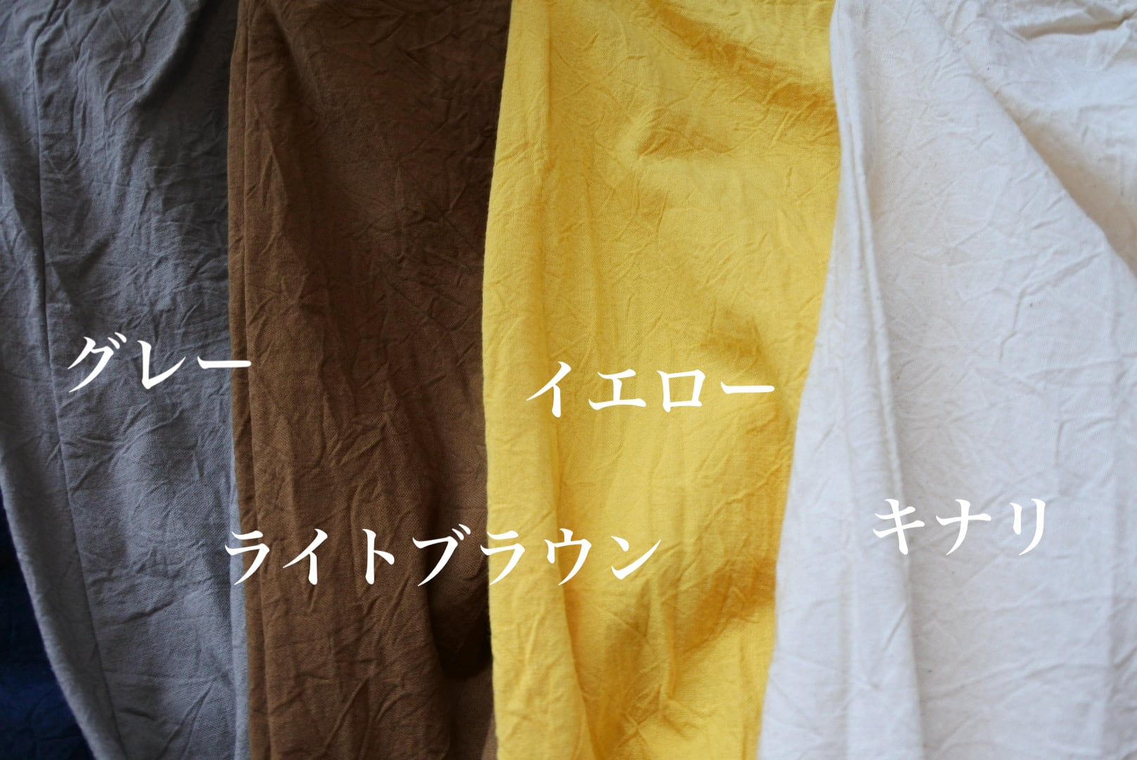 オフ、キナリ以外は透け感も気にならないので1枚で常日着としてもおすすめ。ウエストがゴムのみでポケットがないシンプルな仕様です。