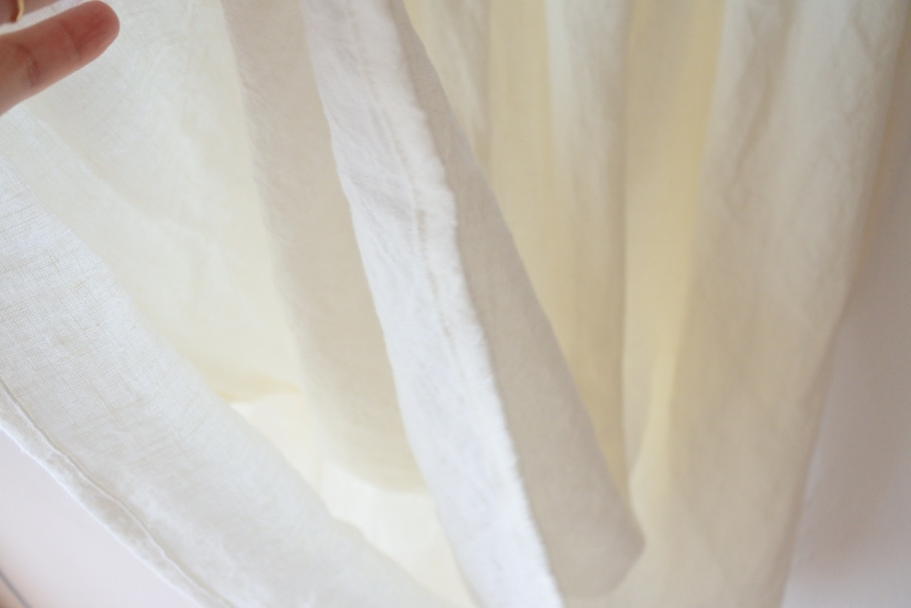 リネン素材の特徴として、植物の茎部分などの原料が入ってしまう場合があります。無理に取ろうとすると、糸切れを起こす恐れがございますので、リネン素材の特有として、ご理解下さい。